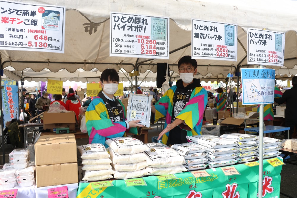 江刺金札米を使った焼きおにぎりを始め、旬の農畜産物や特産品が勢ぞろいのおまつりは大盛況でした。