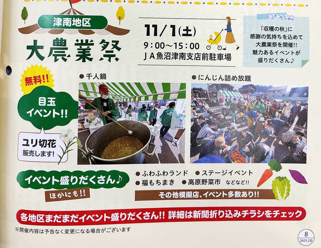 風が冷たく、秋の気候に夏の暑さが懐かしくなるこの時期。津南町では、11月1日にJA魚沼農業祭が行われます。毎年大盛況のこのイベント、今年は合併2年目ということで津南地区だけでなく、それぞれの地区でおにぎりの販売が行われます。他にもステージパフォーマンスがあったり、キッチンカーが来たりと盛りだくさん。楽しい企画をご用意しておりますのでぜひ、この機会に秋の魚沼津南へ遊びに来てみてはいかがでしょうか。みなさまのご来場をお待ちしております。