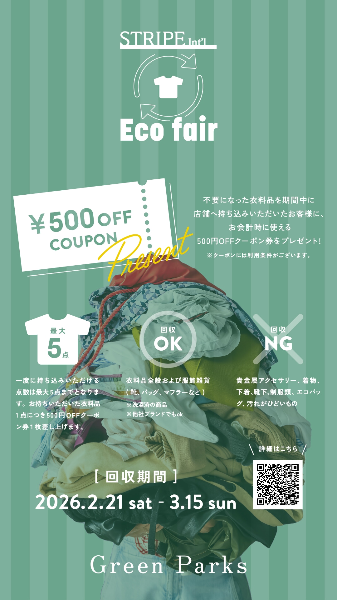 『不要になった衣料品をお持ち込みで500円OFFクーポン券をプレゼント!』Green Parks アピタ伊賀上野期間中、不要になった衣料品を店舗へお持ち込みいただいたお客様に、お会計時に使える500円OFFクーポン券を差し上げます。皆様のご来店お待ちしております!■回収期間2026年2月21日(土)~3月15日(日)■回収対象アイテム衣料品全般および服飾雑貨(靴、バッグ、マフラーなど)※ストライプインターナショナル製品以外も対象※洗濯済みの商品に限ります。■回収対象外アイテム貴金属アクセサリー、着物、下着、靴下、制服類、エコバッグ、汚れがひどいもの■回収点数・1度のお持ち込みにつき最大5点まで・お持ちいただいた衣料品1点につき500円クーポン券を1枚差し上げます 。