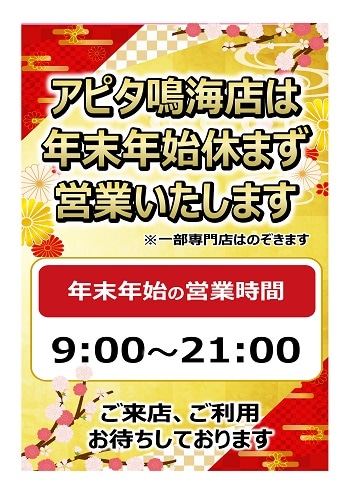 アピタ鳴海店 年末年始の営業時間!アピタ鳴海店は、年末・年始休まず営業致します。