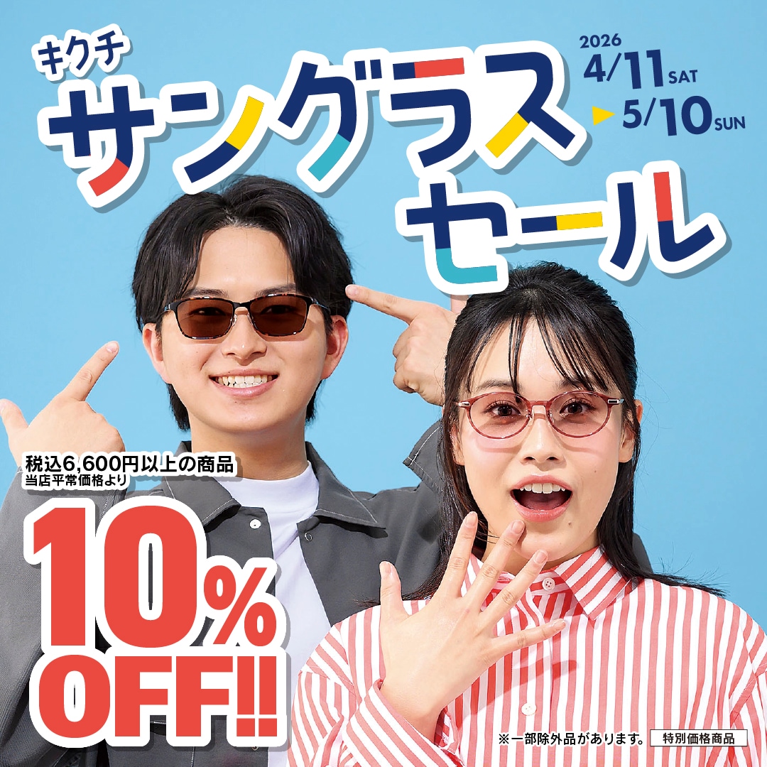 2026年4月11日(土)~5月10日(日)の期間、「サングラスセール」を開催!税込6,600円以上のサングラスが自店平常価格より10%OFFでお求めいただけます。(一部除外品がございます。)夏の準備は今がチャンス!お気に入りのサングラスをお得にGetしましょう!スタッフ一同、ご来店をお待ちしております。 -