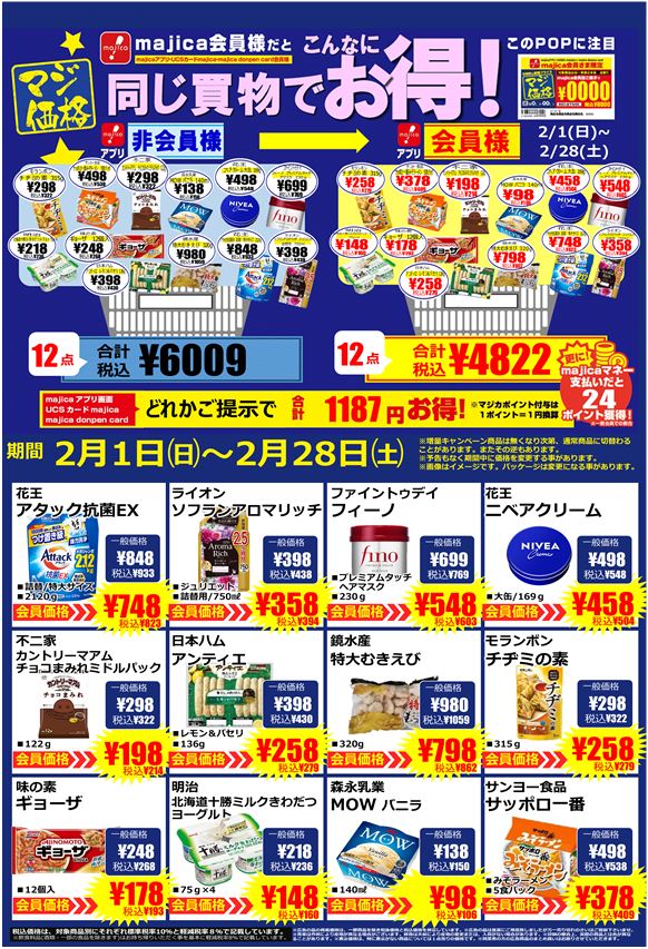 ◆2月度◆圧倒的な破格プライス!!『マジ価格』のお知らせ■マジカ会員様限定■2/1㈰~2/28㈯の期間、圧倒的な破格プライス「マジ価格」を開催!!全店企画&キソアピ限定企画商品が期間中、マジ価格にてお買い求めいただけます。詳しくはチラシをご確認ください。また、チラシではご紹介しきれなかった「マジ価格」商品も多数ご用意いたしております。いつものお気に入り商品や買ったことはないけれど気になっていた商品が見つかるかもしれません。ぜひ、店頭にてご確認ください。皆様のご来店をお待ちしております。※本企画は予告なく、変更・中止になる場合もございます。