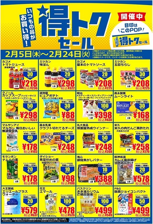 いつもの品がお買い得!『得トクセール』只今、開催中!!今月は、2月5日㈭~2月24日㈫まで『得トクセール』開催!!いつもの品がお買い得にお買い求めいただけるとともに、初めての商品もこの期間にお得にお試しいただけるチャンスです!!チラシ掲載商品は、当店担当者【オススメ20選】となっております。ぜひ、この機会にご利用ください。皆様のご来店をお待ちしております。