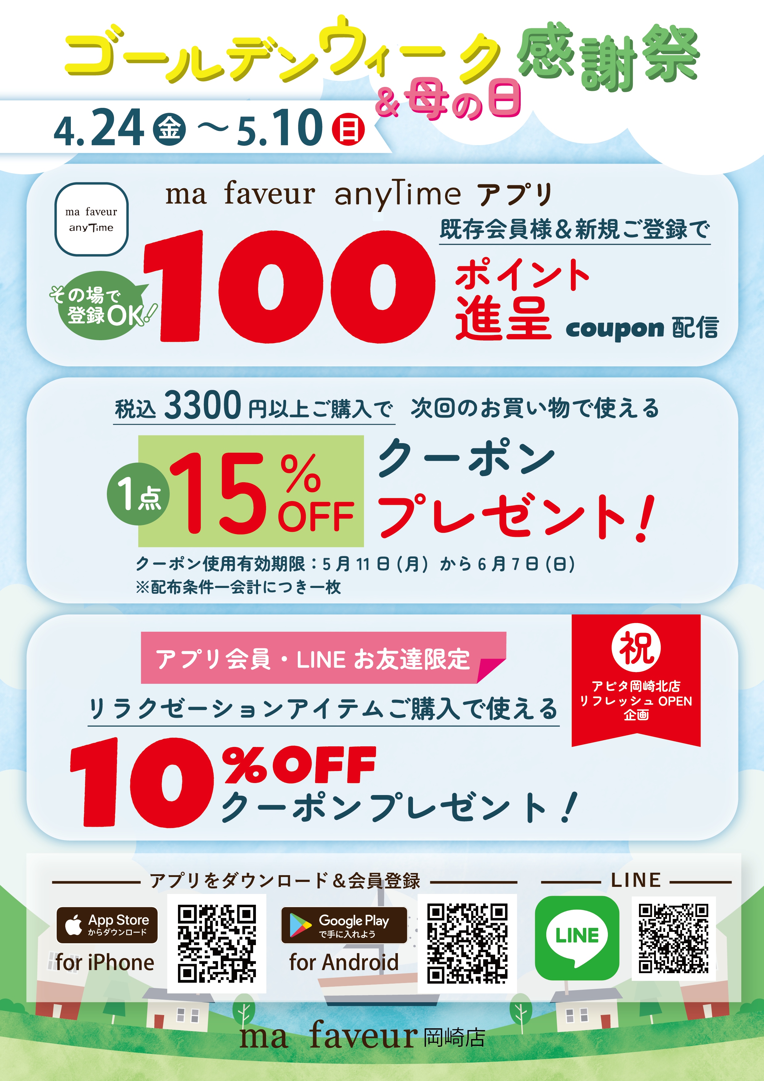 いつも当店をご利用いただきありがとうございますGWに、おトクがたくさんのスペシャルイベントがスタート【期間】4月24日(金)〜5月10日(日)①アプリ登録でポイントGET!期間中、公式アプリを新規ご登録でメンバーズポイント100ptプレゼント※既存会員さまも対象です②お買い物でクーポンプレゼント!税込3,300円以上ご購入で次回使える「1点15%OFFクーポン」プレゼント(利用期間:5/11〜6/7)③アピタ岡崎北店リフレッシュOPEN記念!リラクゼーションアイテムご購入で使える10%OFFクーポンをアプリ&LINEで配信母の日ギフトにもおすすめアイテム多数ご用意しております※各クーポンには除外品・ご利用条件がございます詳しくは店頭POPまたはクーポン利用条件をご確認ください。皆さまのご来店を心よりお待ちしております -