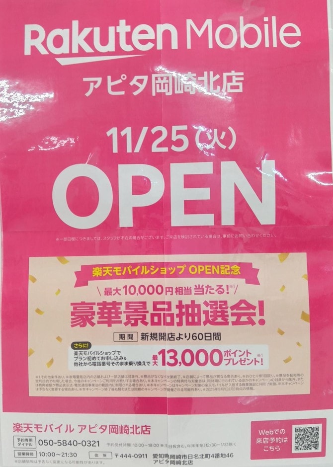 アピタ岡崎北店に携帯ショップ『楽天モバイル』が11月25日(火)にオープンします。楽天モバイルショップOPEN記念として、最大10,000円相当当たる、豪華景品抽選会を開店より60日間開催いたします。携帯電話の新規購入、買い替えをお考えの方この機会に是非ご来店くださいませ。 -