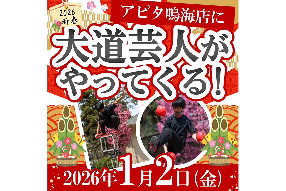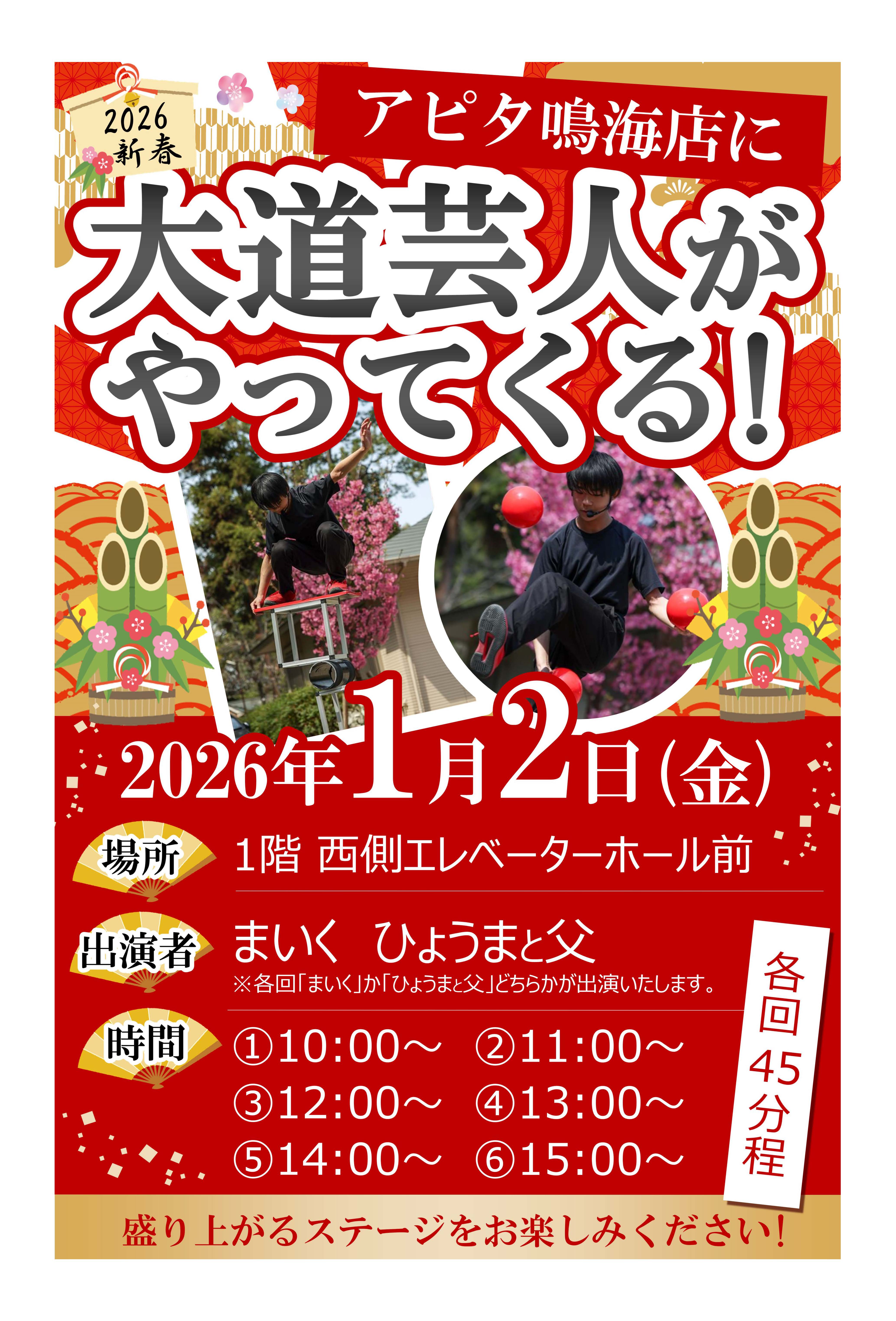 「大道芸人がやってくる!」▼詳しくはこちら▼おめでたい新春、アピタ鳴海店に大道芸人がやってきます!【日程】2026年1月2日(金)【場所】アピタ鳴海店 1階西側エレベーターホール前、所在地:愛知県名古屋市緑区鳴海町字伝治山3番地9【時間】①10:00~②11:00~③12:00~④13:00~⑤14:00~⑥15:00~ 各回45分程度【出演者】まいく ひょうまと父(各回「まいく」か「ひょうまと父」どちらかが出演します)盛り上がるステージパフォーマンスをぜひお楽しみください!