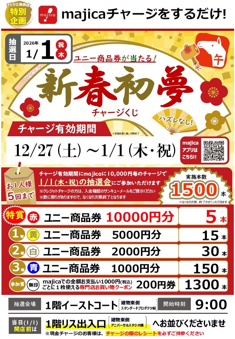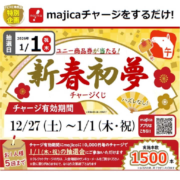 毎年ご好評いただいている新春初夢majicaチャージくじ!2026年の元日も開催いたします。詳細はチラシ画像または店頭チラシをご覧ください。ご参加お待ちしております! -