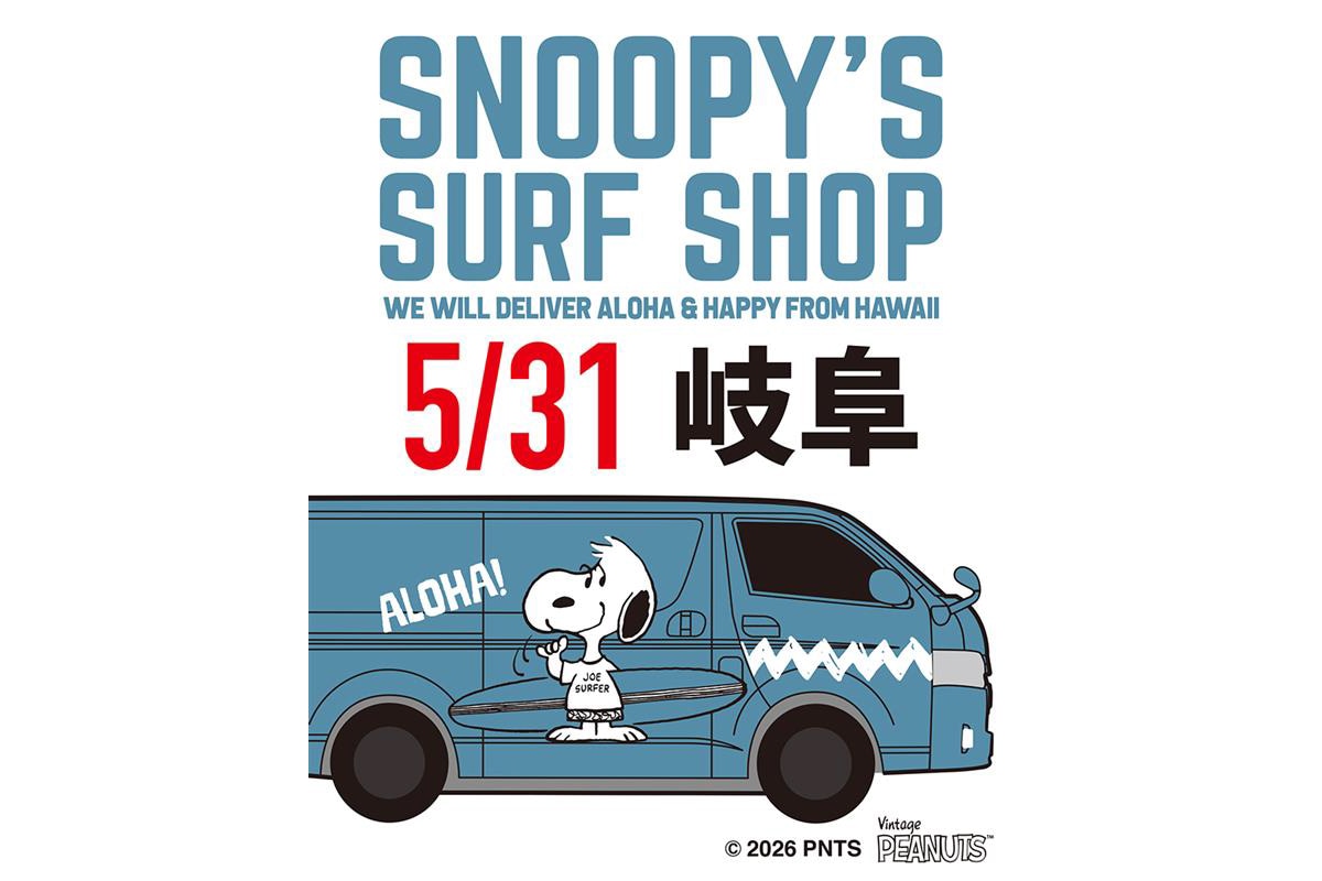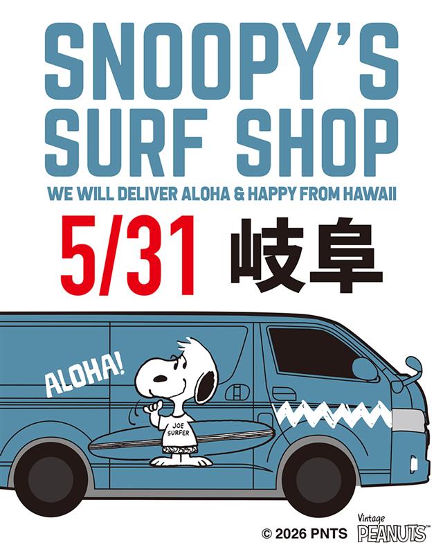 「SNOOPY'S SURF SHOP」がハワイからやって来る!ハワイよりPEANUTSオフィシャルサーフショップのSNOOPY’S SURF SHOPが私たちの町へやって来ます!オアフ島のノースショア・ハレイワタウンで生まれたスヌーピーズサーフショップ。ハワイ旅行に行ったら必ず訪れたいサーフショップが、移動販売車となって私たちの場所に沢山のアロハとハッピーを届けにやって参ります。サーフボードを抱え”JOE SURFER”のTシャツを着てシャカサインをするスヌーピーが目印のオリジナル アートを中心にTシャツやバッグ、雑貨などサーフトリップ中の『PEANUTS』の仲間たちをテーマにしたグッズが盛り沢山。この機会に他では買えないハワイのオリジナルグッズを是非お楽しみください。皆様のお越しをお待ちしております。【日程】 2026 年 5月31日 (日)【場所】 アクアウォーク大垣所在地:岐阜県大垣市林町6丁目80-21販売場所:センターコート【時間】 10:00 ~16:00●お支払い方法●移動販売のお支払い方法はキャッシュレス決済のみとさせて頂きます。ご了承くださいませ。2025年4月1日よりクレジットカードをご利用のお客様には、決済時に暗証番号(PIN)の入力が必要となりました。(VISA / MASTER / JCB / American Express / DISCOVER / Dines Club / QUICPAY / iD / Pay Pay / d払い / R pay /メルpay / au Pay / 交通系IC など可能 )◾️SNOOPY’S SURF SHOP◾️ハワイ発となるPEANUTS オフィシャルショップのSNOOPY’S SURF SHOPが2018年ノースショア・ハレイワタウンに誕生。サーフボードを抱え、JOE SURFERのTシャツを着てシャカサインをするSNOOPYがメインマークとなったショップオリジナルのアートを中心に、サーフグッズ、Tシャツやバッグ、雑貨など南国ハワイを感じさせるアイテムが勢ぞろい。ハワイに1号店としてハレイワ店、2号店にダイヤモンドヘッド店、沖縄に3号店の那覇店、さらに2025年4月に4号店の北谷店、2025年7月に5号店の鎌倉店を出店。世界で5店舗を出店。【SNOOP’S SURF SHOP 公式Website 】http://snoopysurf.com【SNOOP’S SURF SHOP インスタグラム】https://www.instagram.com/snoopys_surfshop_hawaii/ -