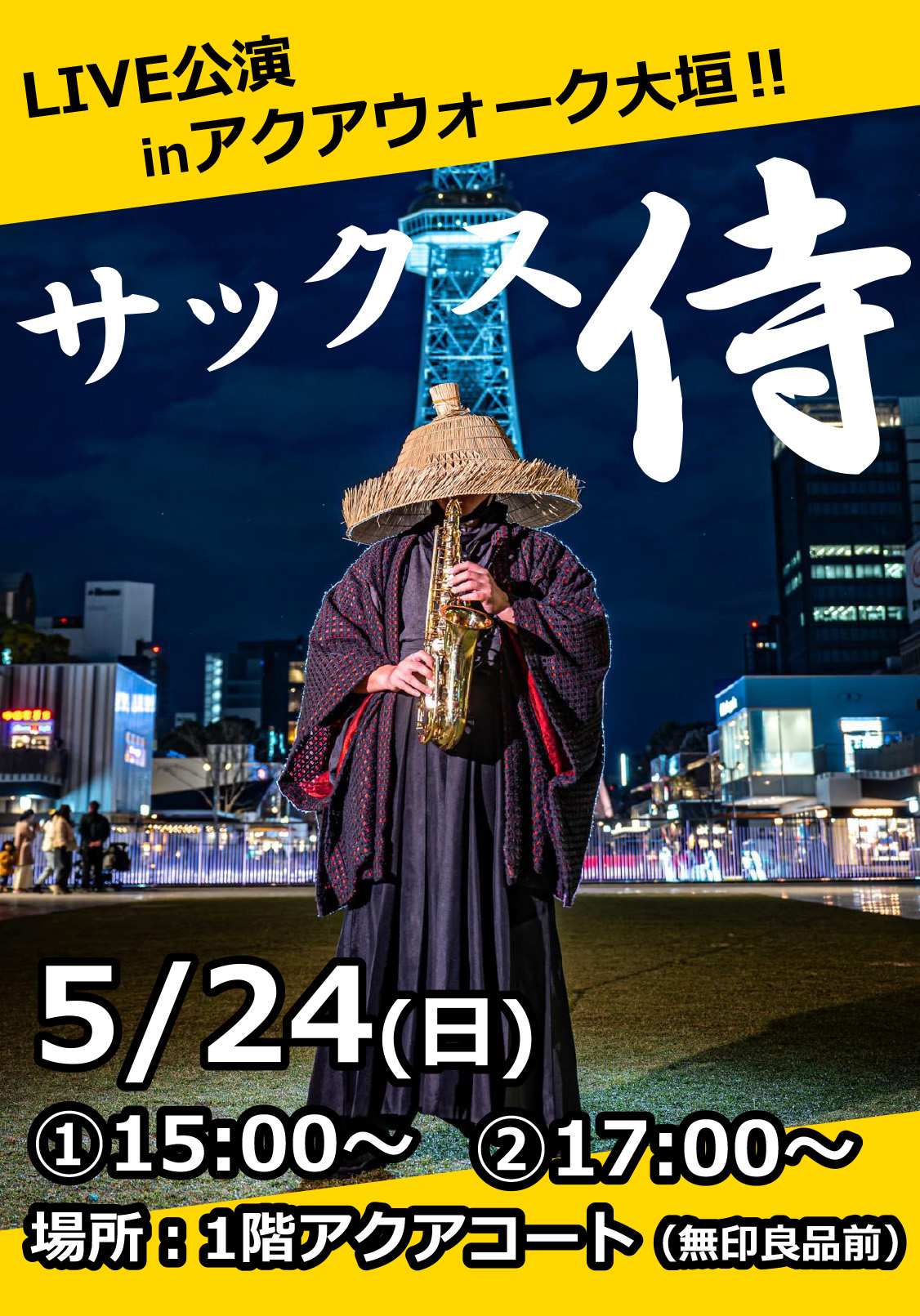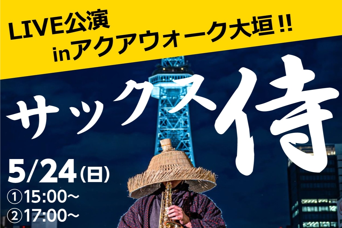 『サックス侍』LIVE公演▼詳しくはこちら▼【日程】2026年5月24日(日)【場所】アクアウォーク大垣 1階アクアコート【時間】①15:00~②17:00~ 各回45分程度アクアウォーク大垣にあの『サックス侍』が参上します!史上5人目となる「名古屋観光特使」──名古屋の街角でサックスを吹く、謎の侍。刀の代わりにサックスを手にし、戦わずして、音で人の心の病みを斬る──心癒すサウンドから「名古屋の動くパワースポット」と呼ばれ、全国から人が集まることから「名古屋の人間観光地」とも称されます。100年以上の歴史を誇る国の登録記念物「鶴舞公園」では、史上唯一の「公式アーティスト」として認定。SNSの総フォロワー数は35万人を超え、名古屋発の“音の観光大使”として注目を集めています。コロナ禍の街角に立ち続け、人々の心に希望の音を届けたその旋律は、まさに──「名古屋の街角が生んだ音色」。どうぞ、サックス侍の演奏をごゆるりとお楽しみください。