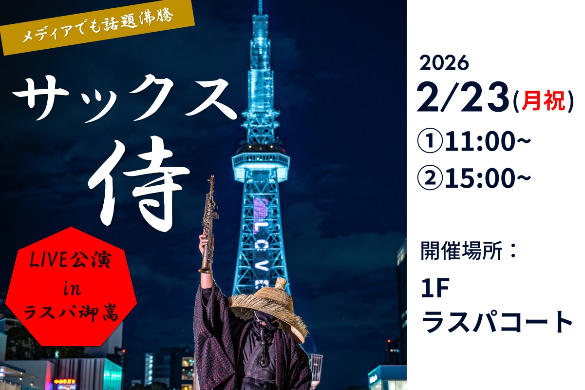 【日程】2026年2月23日(月祝)【場所】ラスパ御嵩店 1階ラスパコート【時間】①11:00~②15:00~ 各回45分程度ラスパ御嵩にあの『サックス侍』が参上します!史上5人目となる「名古屋観光特使」──名古屋の街角でサックスを吹く、謎の侍。刀の代わりにサックスを手にし、戦わずして、音で人の心の病みを斬る──心癒すサウンドから「名古屋の動くパワースポット」と呼ばれ、全国から人が集まることから「名古屋の人間観光地」とも称されます。100年以上の歴史を誇る国の登録記念物「鶴舞公園」では、史上唯一の「公式アーティスト」として認定。SNSの総フォロワー数は30万人を超え、名古屋発の“音の観光大使”として注目を集めています。コロナ禍の街角に立ち続け、人々の心に希望の音を届けたその旋律は、まさに──「名古屋の街角が生んだ音色」。どうぞ、サックス侍の演奏をごゆるりとお楽しみください。