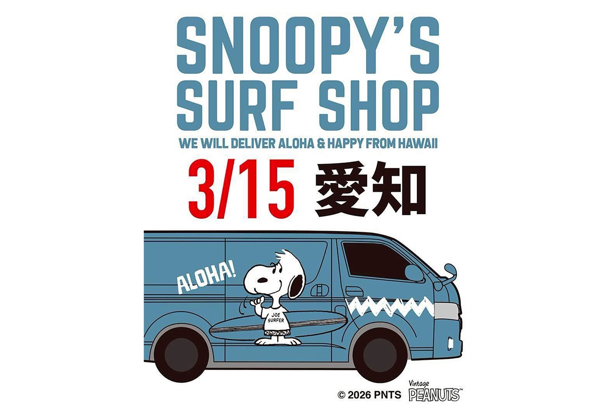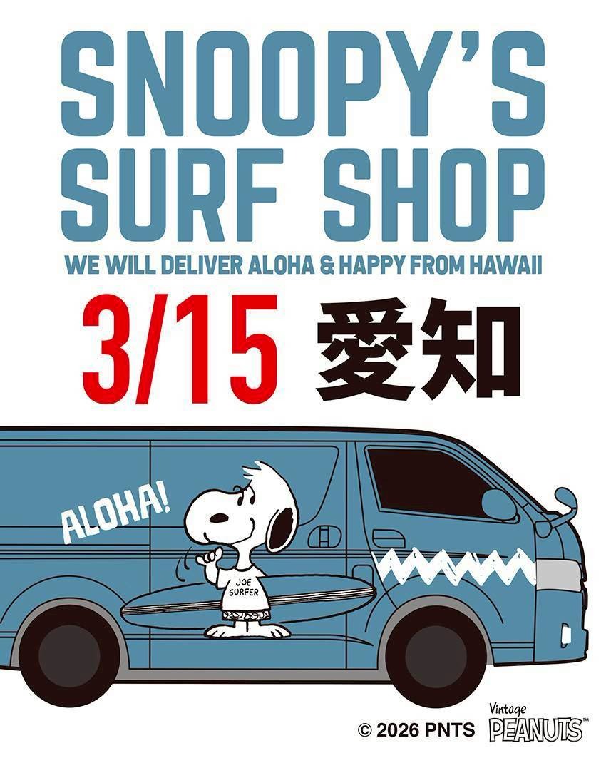「Snoopy's Surf Shop」がハワイからやって来る!▼詳しくはこちら▼ハワイよりPEANUTSオフィシャルサーフショップのSNOOPY’S SURF SHOPが私たちの町へやって来ます!オアフ島のノースショア・ハレイワタウンで生まれたスヌーピーズサーフショップ。ハワイ旅行に行ったら必ず訪れたいサーフショップが、移動販売車となって私たちの場所に沢山のアロハとハッピーを届けにやって参ります。サーフボードを抱え”JOE SURFER”のTシャツを着てシャカサインをするスヌーピーが目印のオリジナルア ートを中心にTシャツやバッグ、雑貨などサーフトリップ中の『PEANUTS』の仲間たちをテーマにした グッズが盛り沢山。この機会に他では買えないハワイのオリジナルグッズを是非お楽しみください。皆様のお越しをお待ちしております。【日程】 2026 年3月15日(日)【場所】 エアポートウォーク名古屋所在地:愛知県西春日井郡豊山町大字豊場字林先1番8販売場所:公園側アピタ05ゲート出入口【時間】 10:00 – 16:00.jpg)
