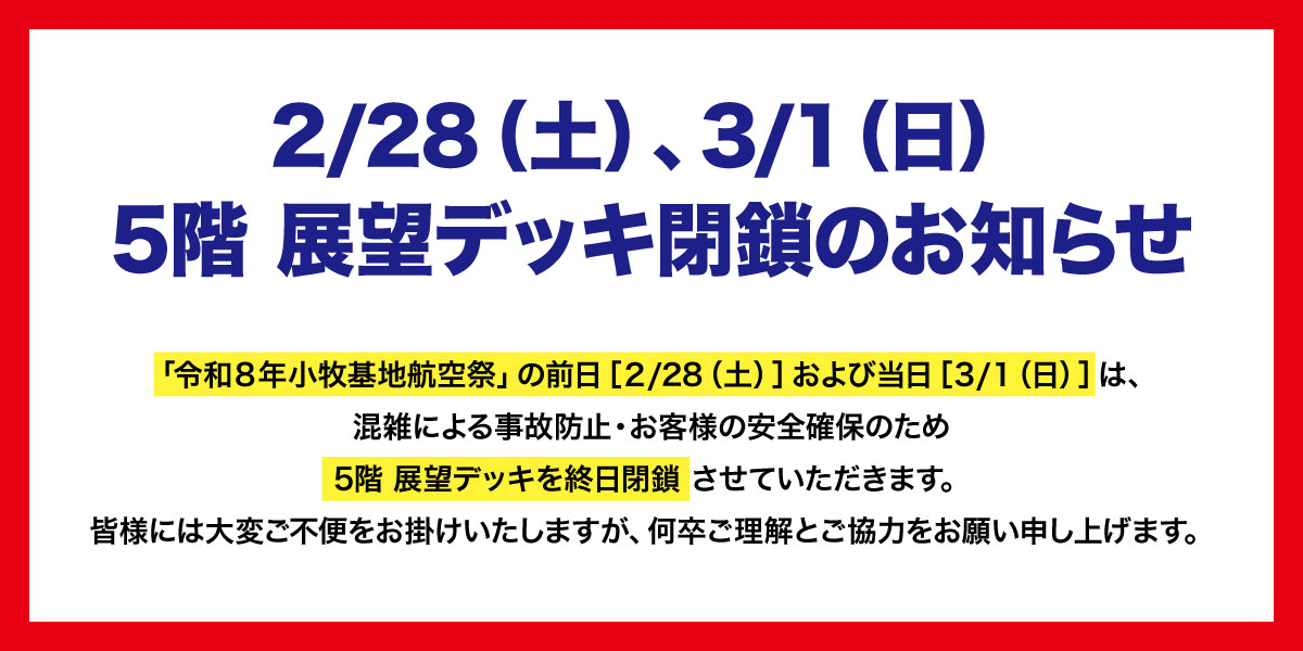 <展望デッキ閉鎖のお知らせ>「令和8年小牧基地航空祭」の前日(2/28(土))および当日(3/1(日))は、展望デッキを終日閉鎖させていただきます。皆様には大変ご不便をおかけいたしますが、混雑による事故防止・お客様の安全確保のため、何卒ご理解とご協力をお願い申し上げます。 -