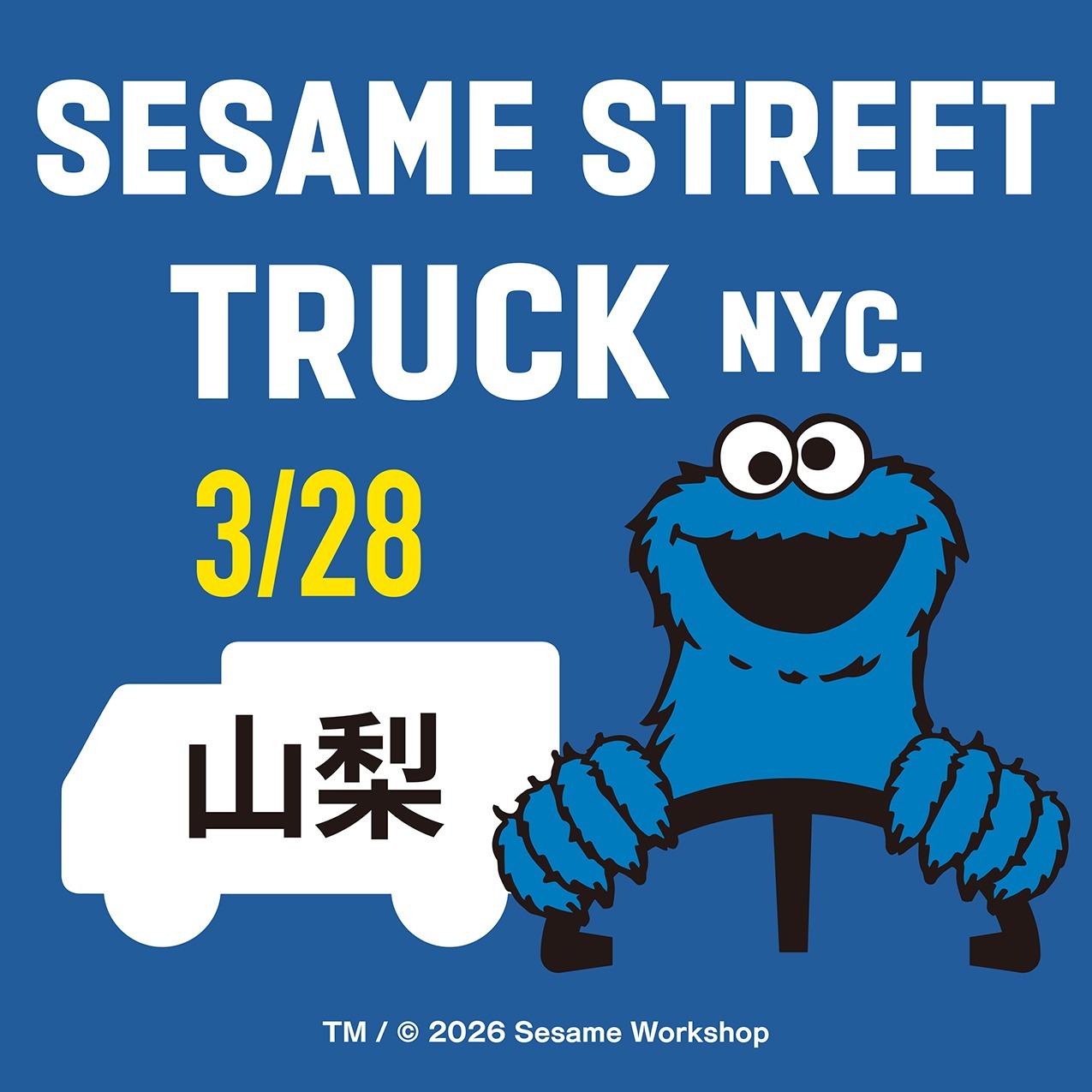 「セサミストリートトラック」 があなたの町にやって来る!▼詳しくはこちら▼⽇本初となるセサミストリート公式移動販売⾞、セサミストリートトラックが あなたの町にやってきます。3 ⽉ 28⽇ (土) は、「ラザウォーク甲斐双葉店」に停⾞いたします!ハンドルを持つクッキーモンスターがアイコンとなったオリジナルアートを中⼼に、Tシャツやバッグ、雑貨など、セサミストリートトラックとその仲間をテーマにした アイテムが盛りだくさん!セサミストリートトラックでしか出会えないオリジナルグッズを是⾮お楽しみください♪移動販売 開催スケジュール【⽇程】2026 年 3⽉ 28⽇ (土)【場所】ラザウォーク甲斐双葉店【住所】山梨県甲斐市志田 柿木645-1番地【時間】10:00 ~ 16:00※当イベントは⾬天決⾏です。ただし台⾵などの荒天の際は中⽌になる場合もあります。 -