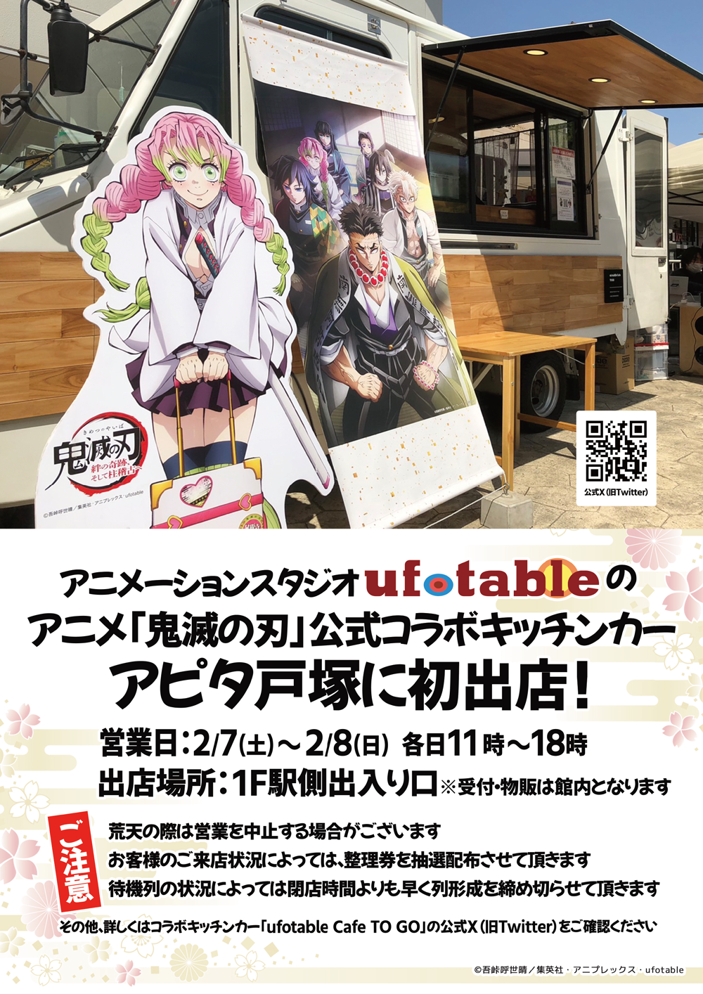 「鬼滅の刃」キッチンカーが初出店!▼詳しくはこちら▼アニメーションスタジオ ufotableの アニメ「鬼滅の刃」公式コラボキッチンカー アピタ戸塚店に初出店!営業日:2/7(土)~2/8(日)時間:各日11時~18時出店場所:1F駅側出入口※物販の販売は館内となります。