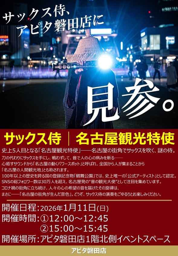 イベント案内『サックス侍 アピタ磐田店に見参』名古屋観光特使『サックス侍』がアピタ磐田店にやってくる!開催日程:2026年1月11日(日)開催時間:①12:00~12:45 ②15:00~15:45開催場所:1階北側イベントスペースSNSの総フォロワー数は30万人を超え、名古屋発の❝音の観光特使”として注目を集めています。まさに「名古屋の街角が生んだ音色」どうぞ、サックス侍の演奏をごゆるりとお楽しみください。 -