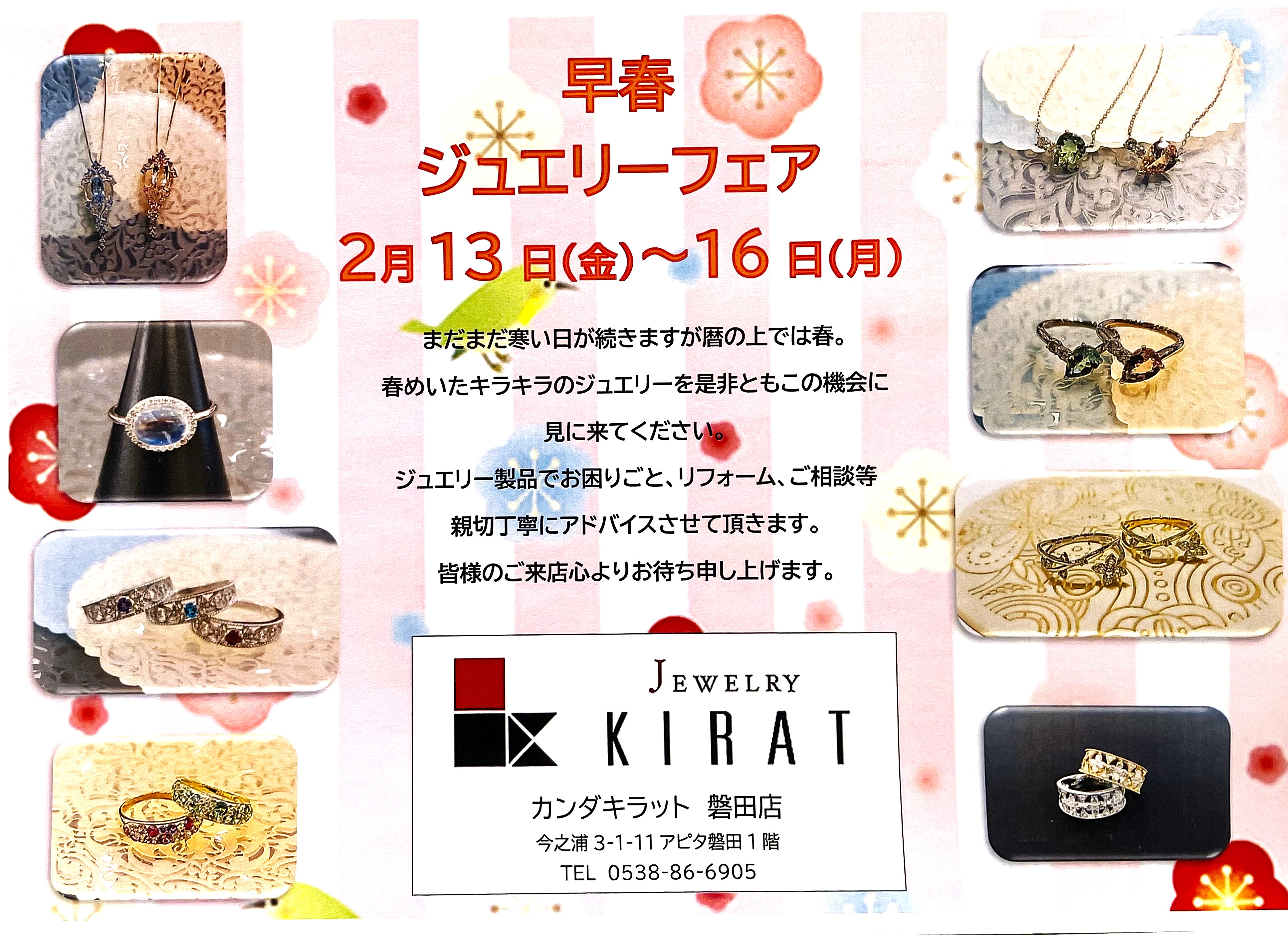 1階KIRATより『✫新作ジュエリーフェア✫決算セールも同時スタート!』開催日時【2月13日(金)~2月16日(月)メーカー協賛の特別な4日間!最高品質の輝きダイヤモンドはもちろん、ルビー・サファイヤ・タンザナイトなどの鮮やかな石色の数々、滅多に見ることのできない希少石、ラリマーや珊瑚、などなど沢山のジュエリーが並びます☆彡『2/13からは、決算セールもスタート!』店内商品は一部商品を除き、なんと30%OFF!!このチャンス、お見逃しなく!!“”お持ちのジュエリー無料クリーニングいたします“”修理加工、パールネックレスのワイヤー交換やリングのサイズ直しなど、いつでもお気軽にご相談ください♪只今、地金下取り 30%UP!!★スタッフ一同、みなさまのご来店を心よりお待ちしております★ -