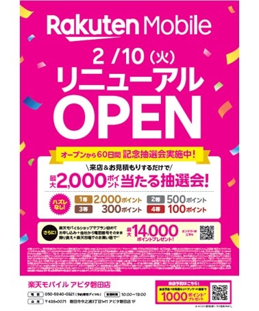 1階楽天モバイルより『リニューアルオープンのお知らせ』楽天モバイルは2月10日(火)にリニューアルオープンいたします。皆様のお越しをお待ちいたしております。 -
