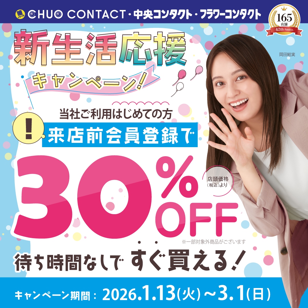1階中央コンタクトより『新生活応援キャンペーン開催中!』開催期間:2026年1月13日(火)~3月1日(日)期間中、はじめて中央コンタクトをご利用の方は、LINEから事前会員登録していただくと、対象のコンタクトレンズが店頭価格(税込)から最大30%OFF!!※一部対象外商品がございます。 ※他割引・キャンペーンとの併用不可事前会員登録のご案内は中央コンタクト公式ホームページにて!この機会にぜひご来店くださいませ。 -