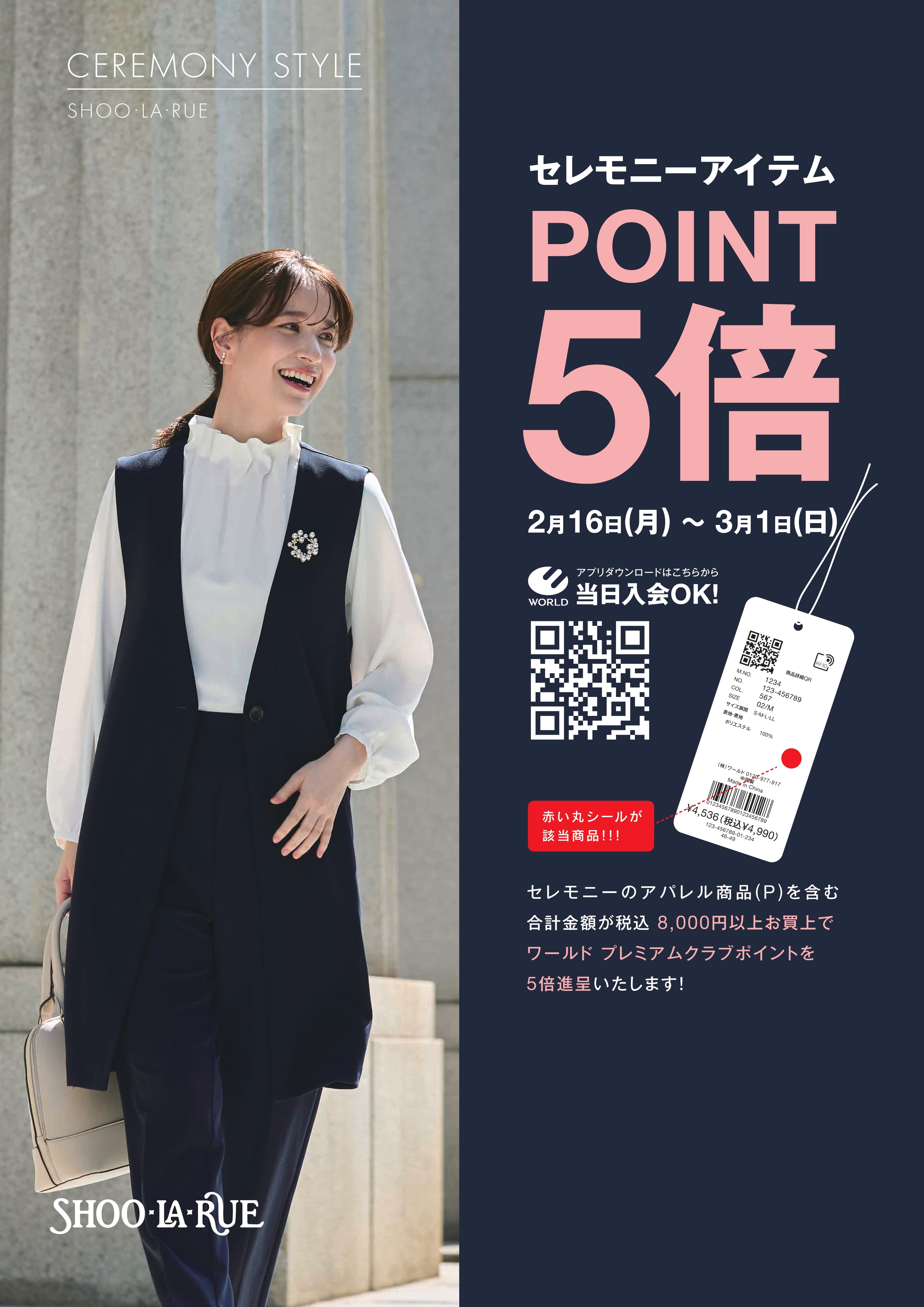 1階シューラルーより『セレモニーアイテム ポイント5倍キャンペーン!』セレモニー対象のアパレル定価商品含む、税込み8,000円以上お買上でワールドプレミアムクラブポイントを5倍進呈いたします!※アプリ・LINE・カード全て対象。当日入会も可。店内ではこれからの季節にぴったりのライトアウターやデニムなど、春物商品も多数ご用意いたしております。是非この機会に1階シュラルーまで足をお運びくださいませ。スタッフ一同、心よりお待ち申し上げております。 -