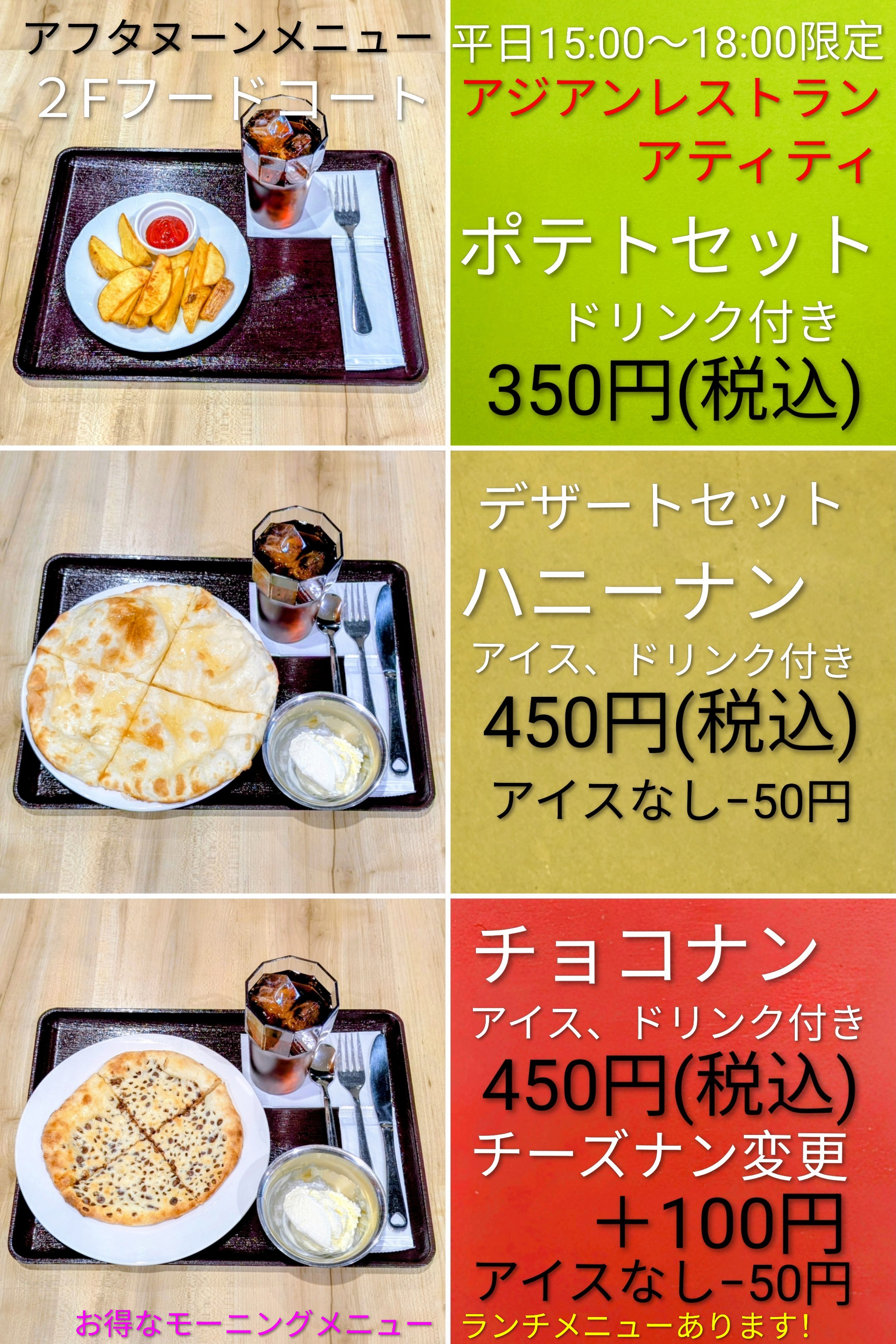 2階、フードコート内アジアンレストラン アティティより『アフタヌーンメニュー登場!』アジアンレストラン アティティより、お得なアフタヌーンメニュー登場です!★平日15:00~18:00の限定メニュー!ドリンク付きのポテトセット350円(税込)ドリンク付きのデザートセット450円(税込)★午前はお得なモーニングメニュー!ドリンク付きモーニングセット350円(税込)~★お昼はお得にランチメニュー!カレーライス500円(税込)~アジアンレストラン アティティで一日中、美味しいアジアン料理を、お得にお楽しみください! -