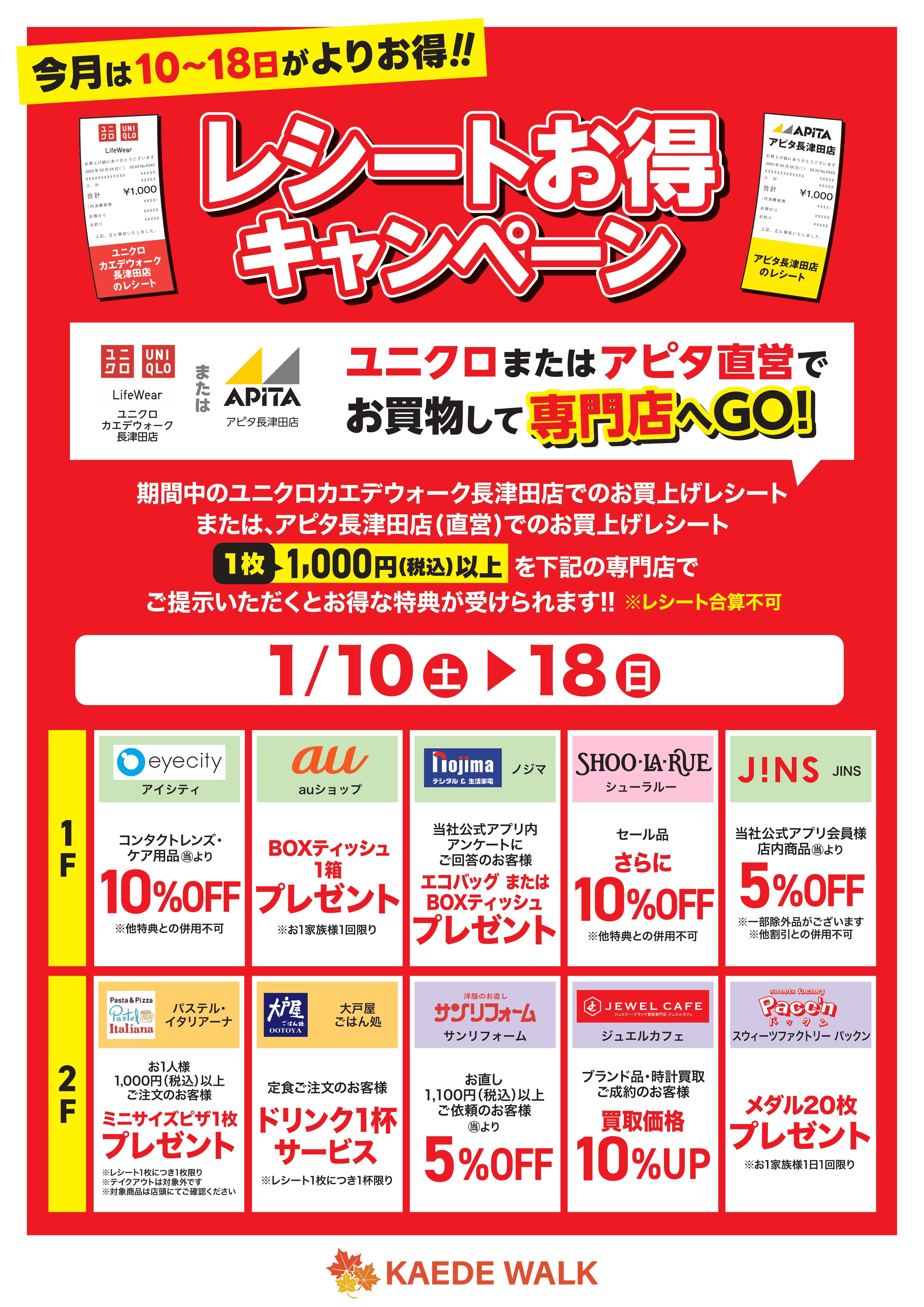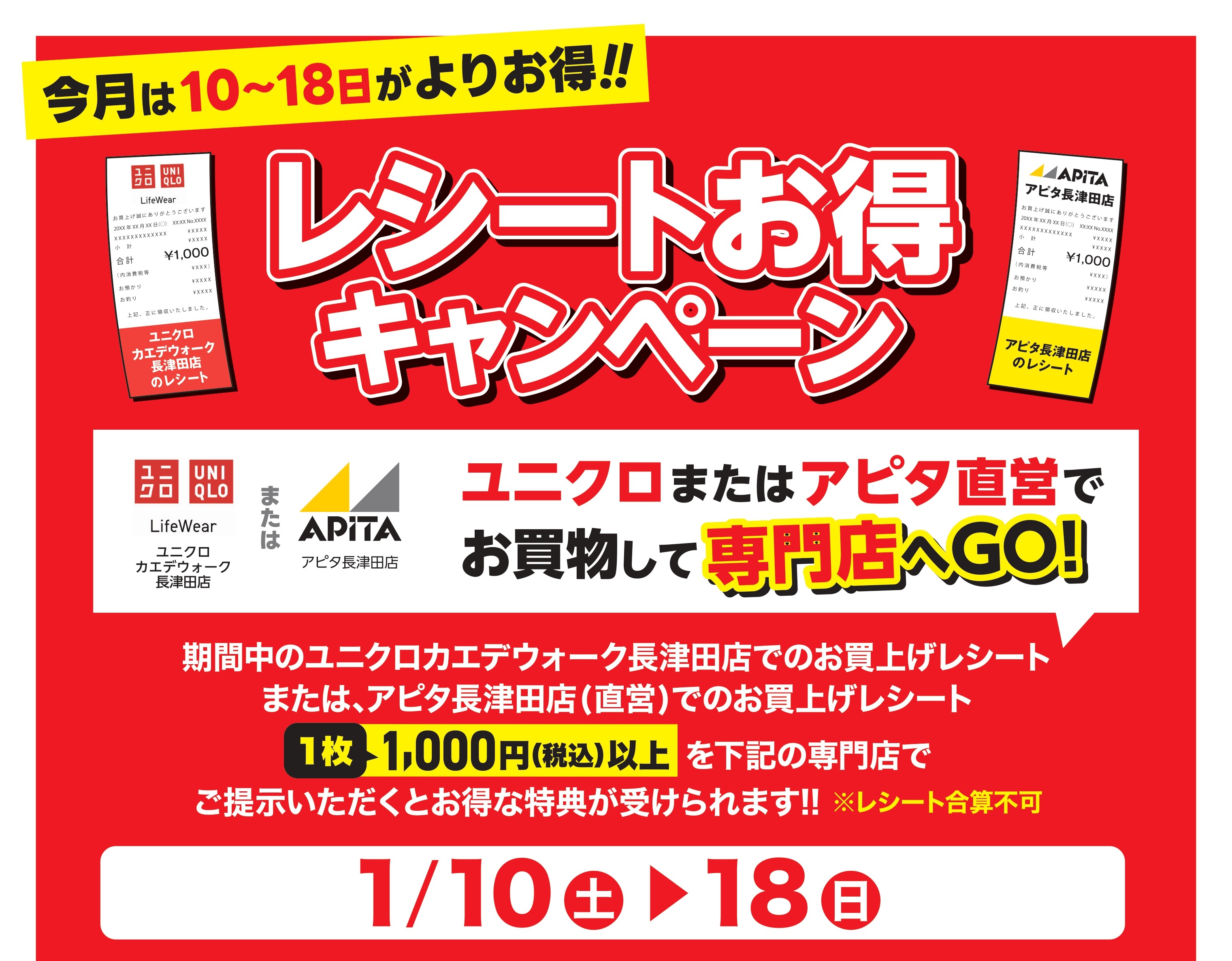 【1月10日▶18日がよりお得!レシートお得キャンペーン】▼詳しくはこちら▼ユニクロまたはアピタ直営でお買物して専門店へGO!ユニクロまたはアピタ直営売場でのお買上げレシート 1枚1,000円(税込)以上をご提示でお得な特典!期間中のユニクロカエデウォーク長津田店 または、アピタ長津田店(直営)のお買上げレシート1枚1,000円(税込)以上をご提示いただくとお得な特典を受けられます!!※レシート合算不可.jpg)