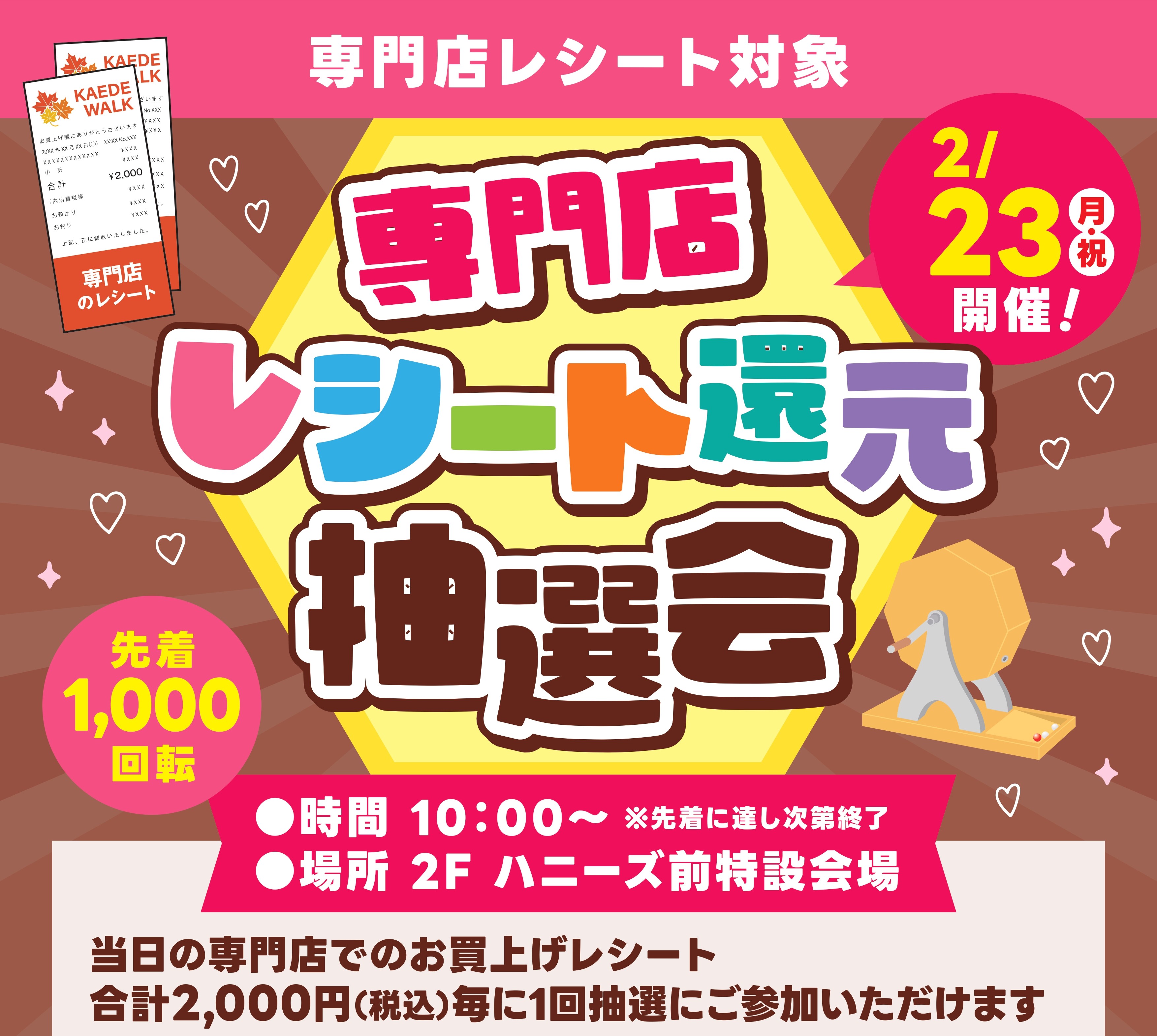 2/23(月祝) 【専門店レシート対象】 専門店レシート還元抽選会!▼詳しくはこちら▼専門店レシート還元抽選会!当日の専門店でのお買上げレシート合計2,000円(税込)毎に1回抽選にご参加いただけます