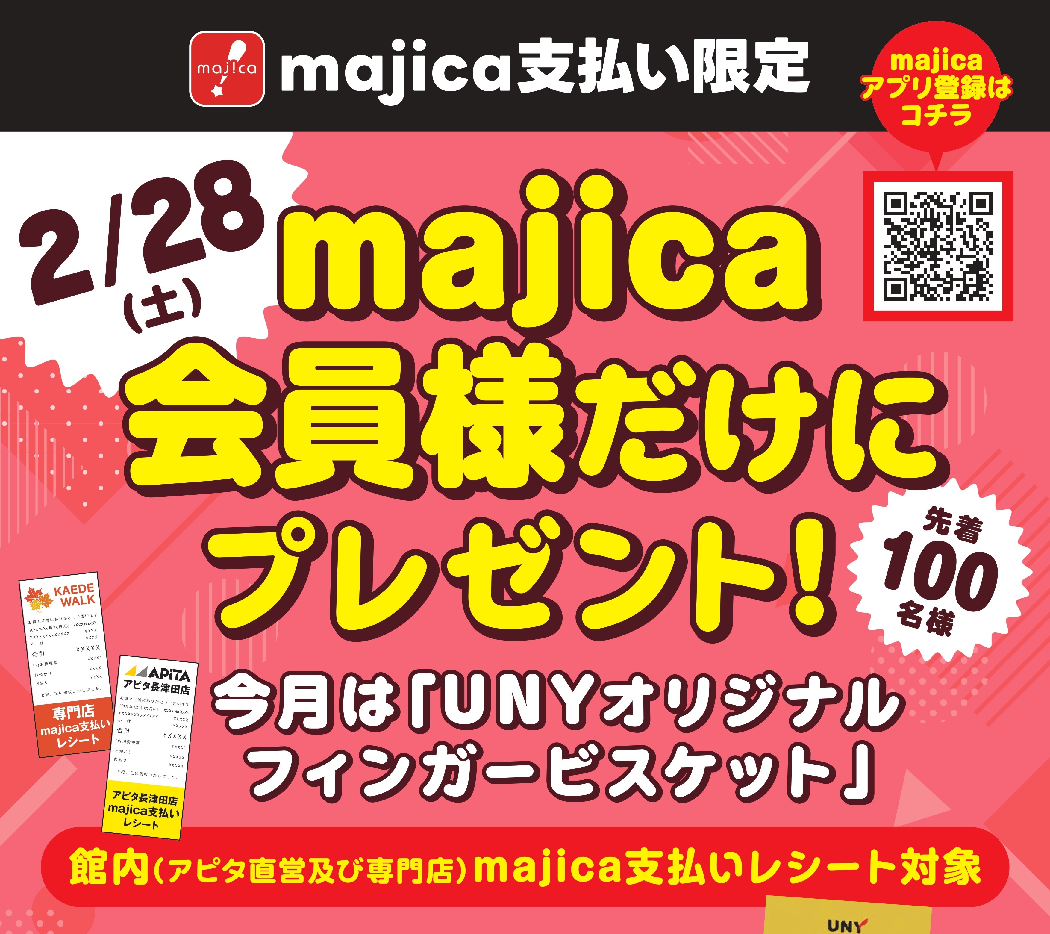 2/28(土)【majica支払い限定】majica会員様だけにプレゼント!!▼詳しくはこちら▼当日の館内(アピタ直営及び専門店)でのmajica支払いレシート合計3,000円(税込)以上をご提示で今月は「UNYオリジナル フィンガービスケット」をプレゼント.jpg)