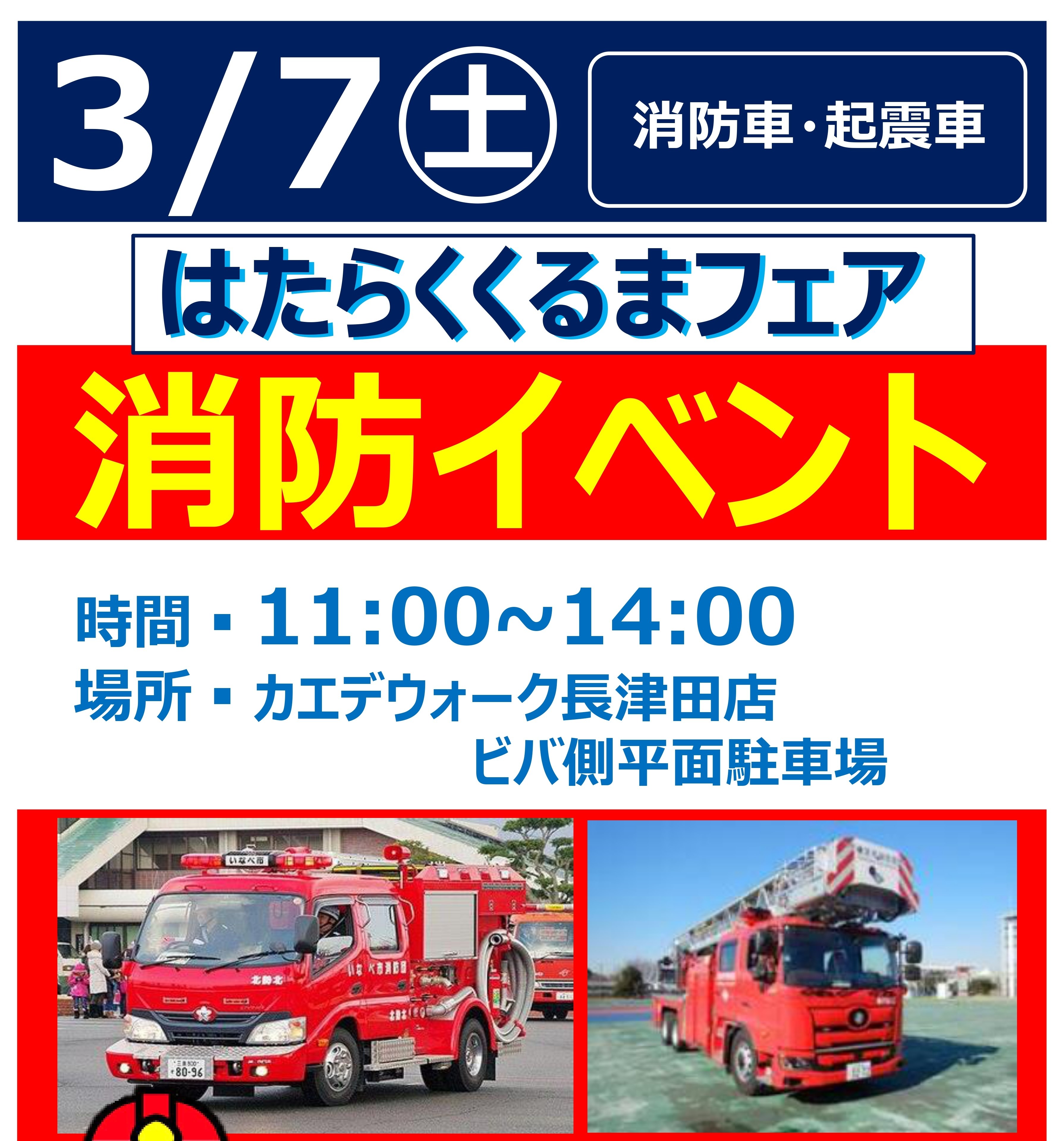 3/7(土)【はたらくくるまフェア】消防イベント!消防車がやってくるヨ!▼詳しくはこちら▼消防の制服を着て記念撮影や起震車体験ができます。カエデウォーク長津田店ビバ側平面駐車場にて雨天の場合は中止とさせていただきます。