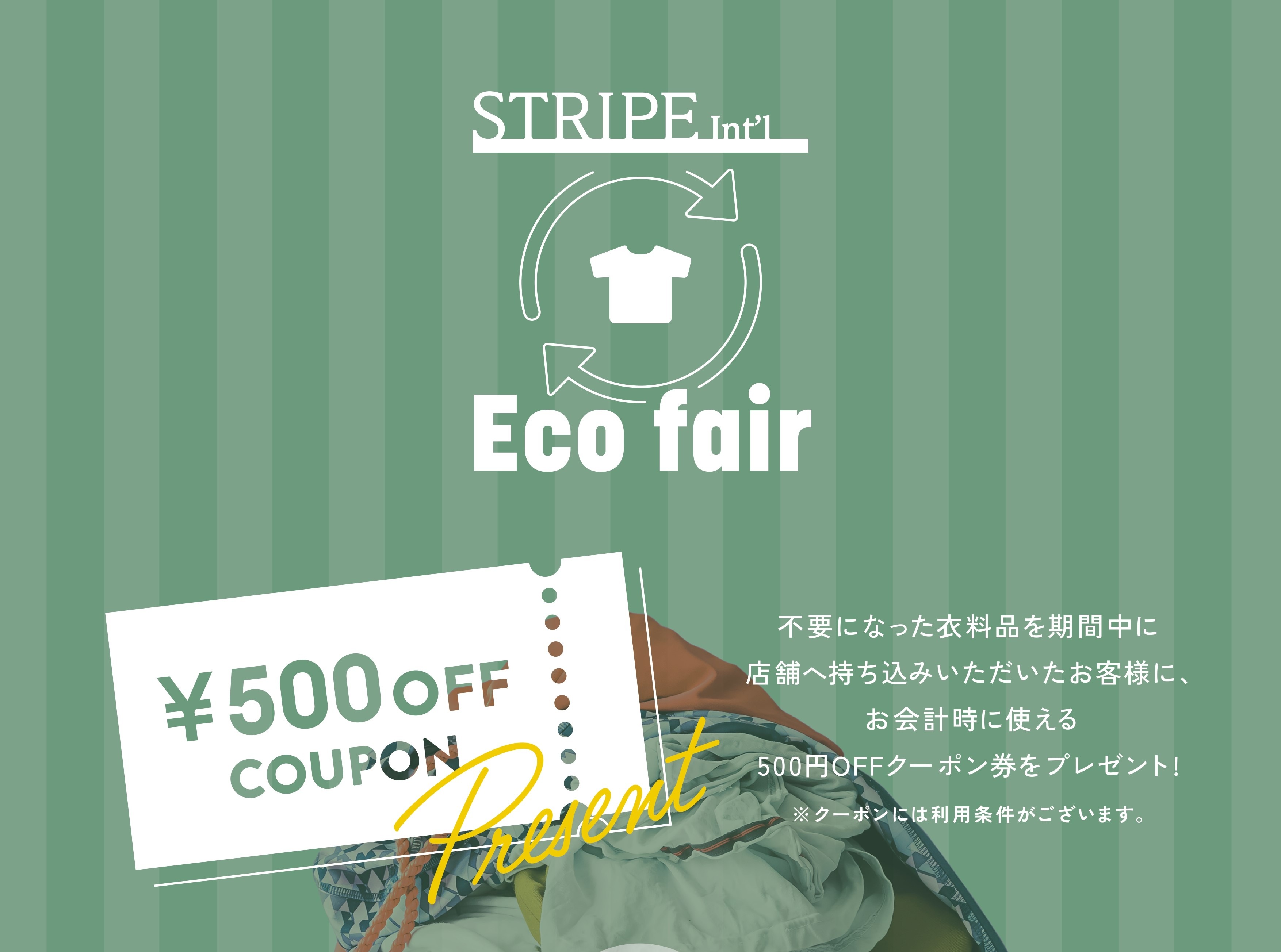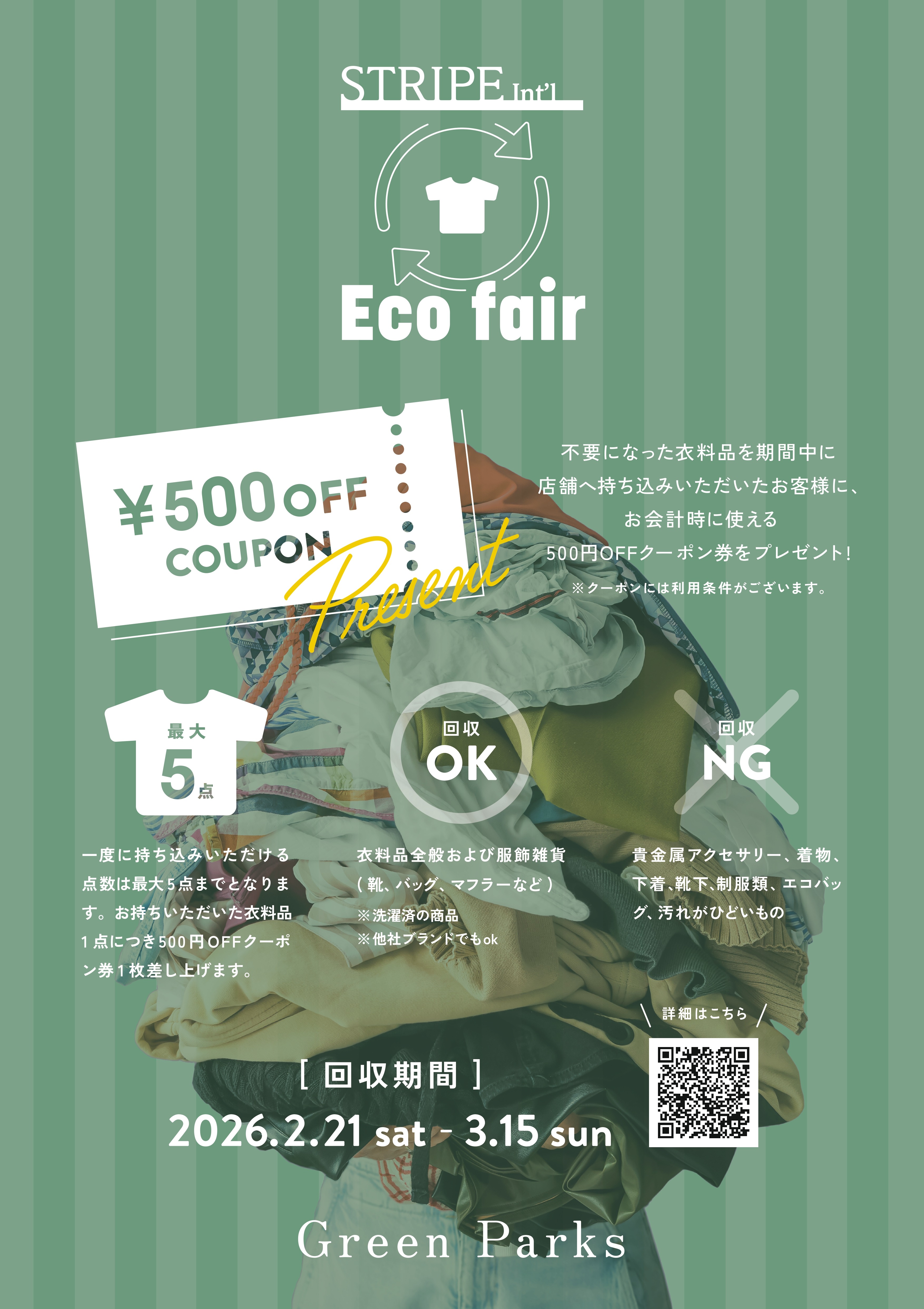 2/21(土)~3/15(日) STRIPE Eco fair 1Fグリーンパークストピックにて▼詳しくはこちら▼不要になった衣料品を期間中に店舗へ持ち込みいただいたお客様に、お会計時に使える500円OFFクーポン券をプレゼント!.jpg)