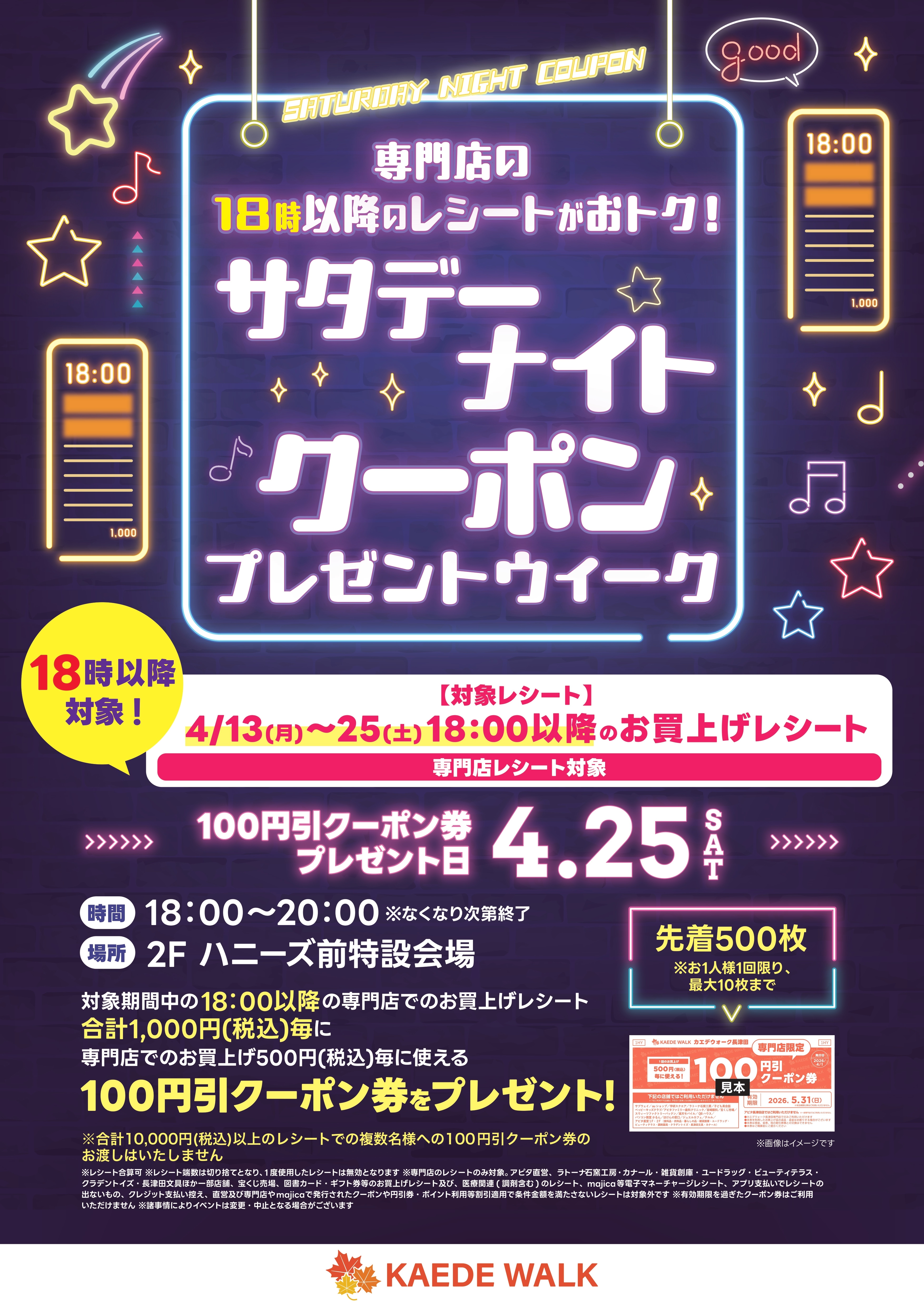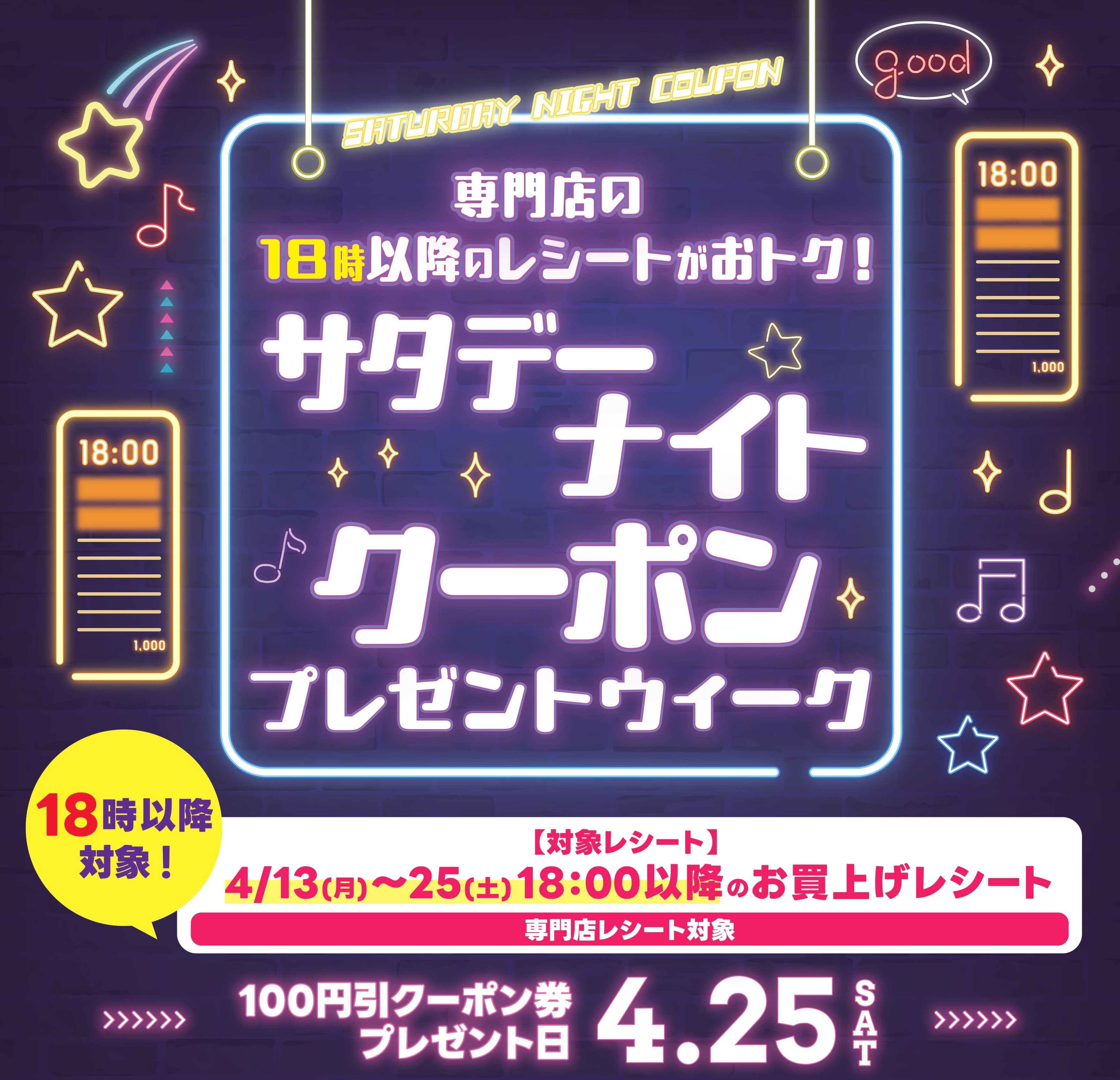 4/25(土) 18:00~20:00【専門店レシート対象】サタデーナイトクーポン プレゼントウィーク▼詳しくはこちら▼ -