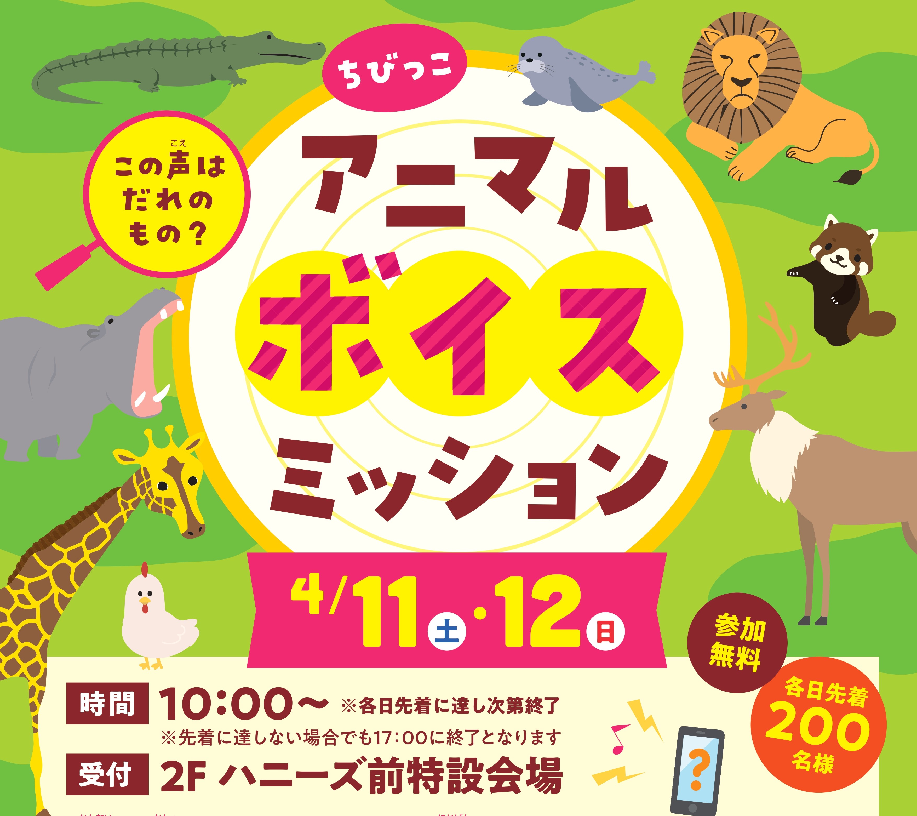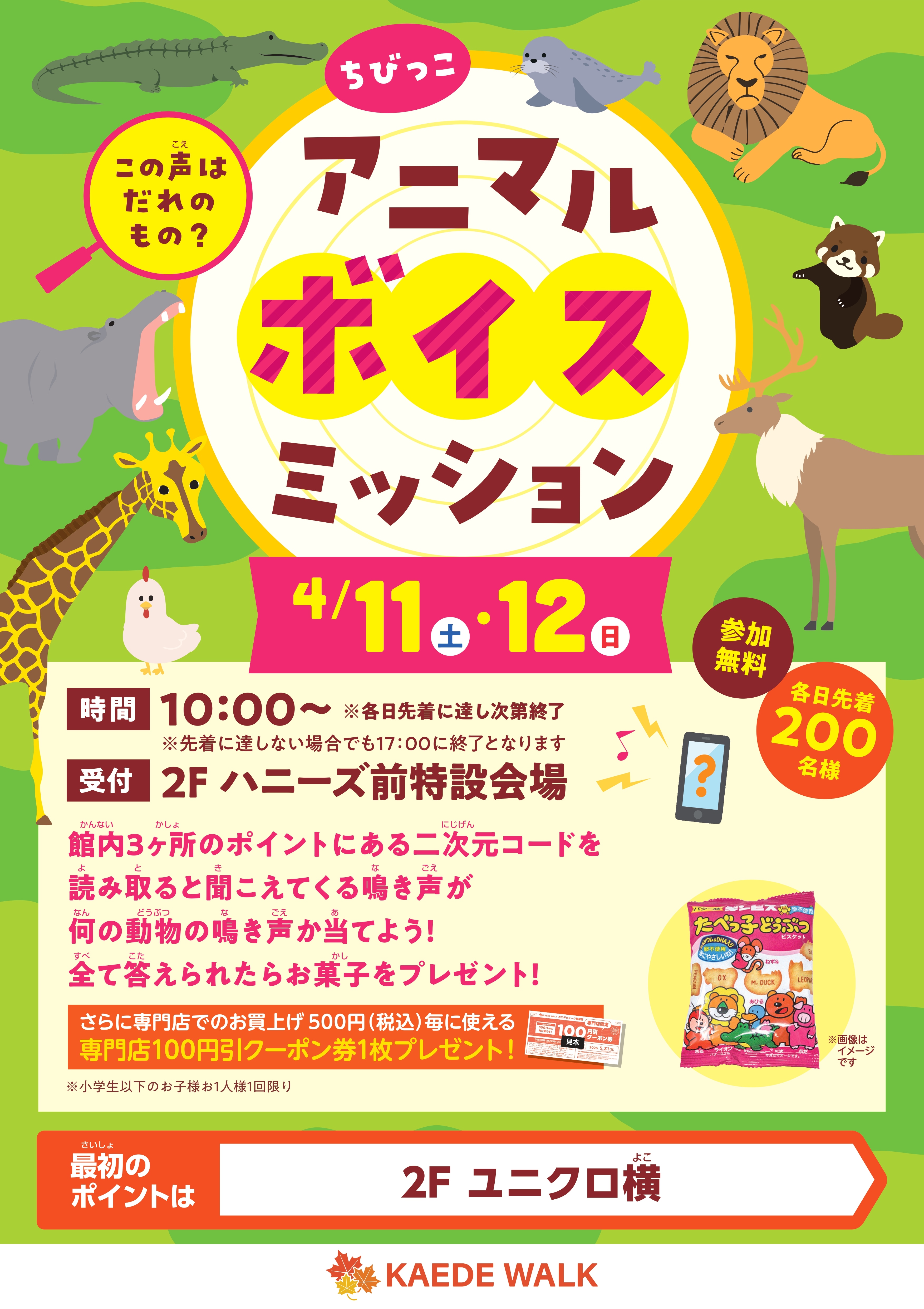 4/11(土)・12(日)【ちびっこ】【参加無料】この声はだれのもの?アニマルボイス ミッション▼詳しくはこちら▼館内3ヶ所のポイントにある二次元コードを読み取ると聞こえてくる鳴き声が何の動物の鳴き声か当てよう!全て答えられたらお菓子をプレゼント!