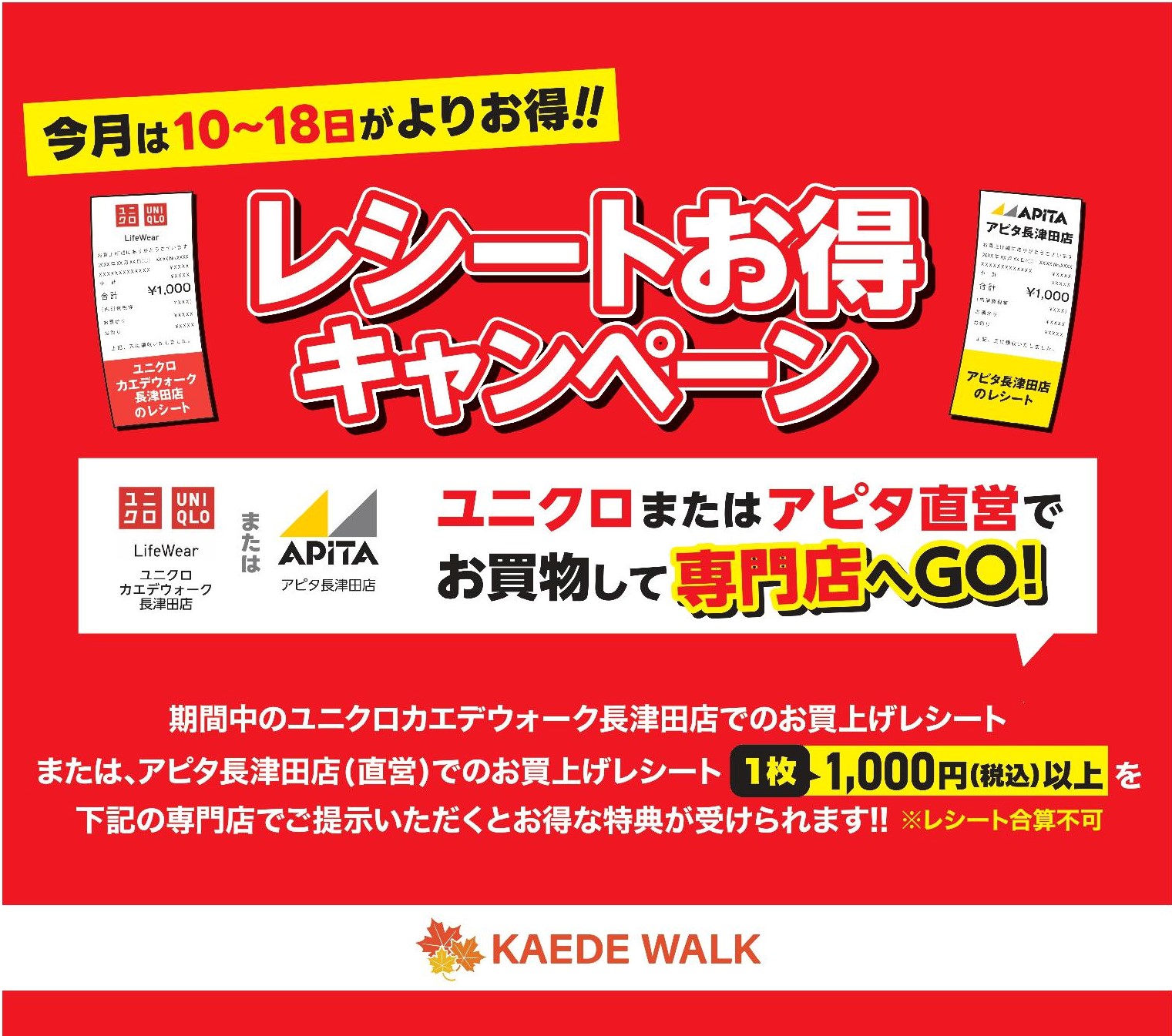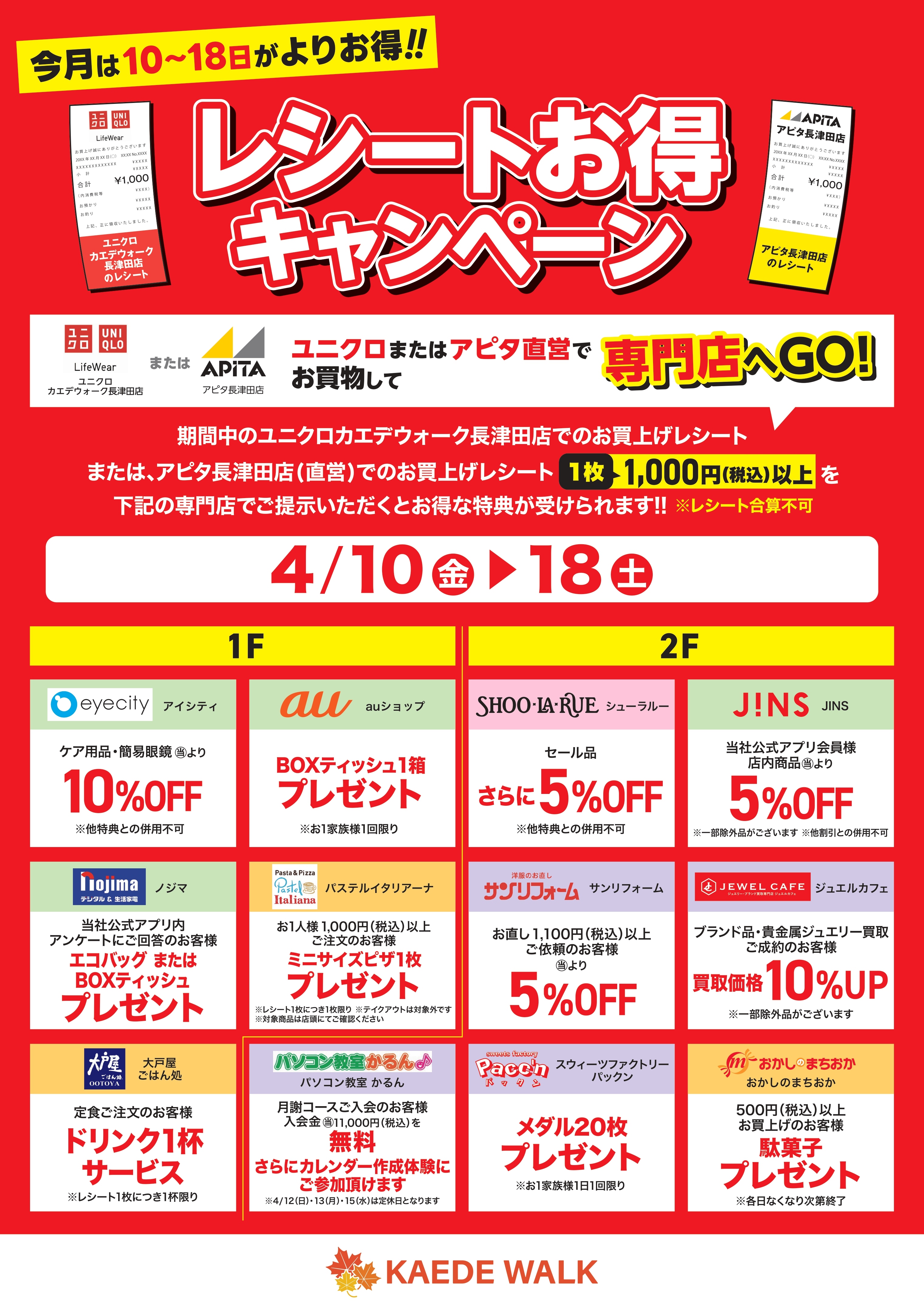 4/10(金)~18(土)レシートお得キャンペーン!ユニクロまたはアピタ直営でお買物して専門店へGO!▼詳しくはこちら▼ -