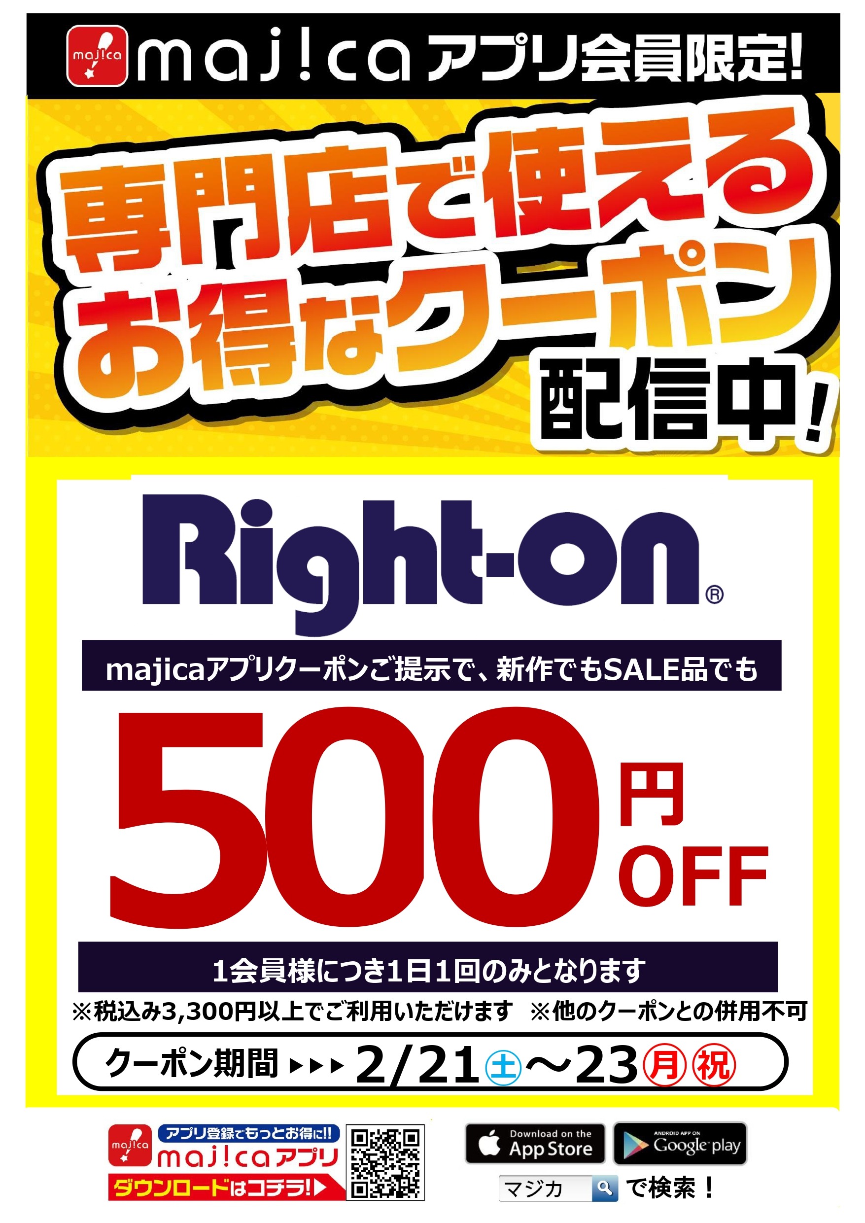 2/21(土)~23(月祝)専門店で使えるお得なクーポン配信!ライトオンがお得!▼詳しくはこちら▼【majicaアプリ会員さま限定】専門店で使えるお得なクーポン配信!見せるクーポンからクーポン取得保有お願いします。クーポン配信開始は当日7:00~となります。