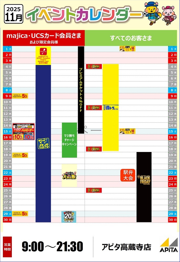 11月 イベントカレンダーmajica・UCSカード会員さま【サンキューデー】毎月3回、9の付く日11月は9日(日)19日(水)29日(土)開催します!!60歳以上のお客さま【ハッピーデー】衣料品・暮らしの品がお値打ちに!!11月は3日間 14日(金)15日(土)16日(日)開催します!!すべてのお客さま【ブラックフライデー】11/19(水)~ -