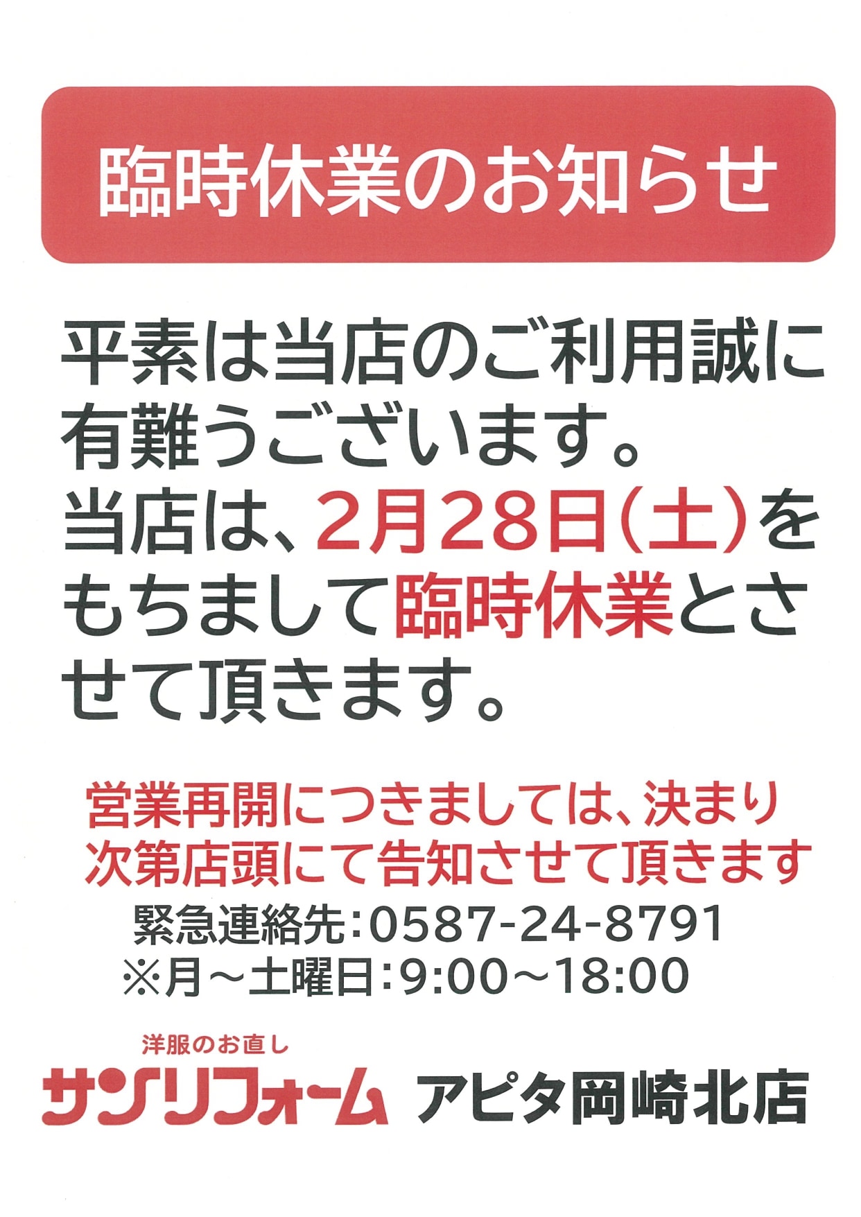 2F [洋服のお直し] サンリフォーム 店舗情報 TEL 0564-26-1092 営業時間 10:00~19:00 定休日 URL https://www.sun-reform.jp/ アピタ岡崎北店店舗ページはこちら 戻る