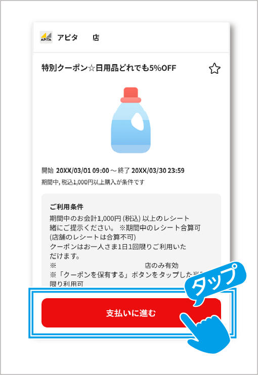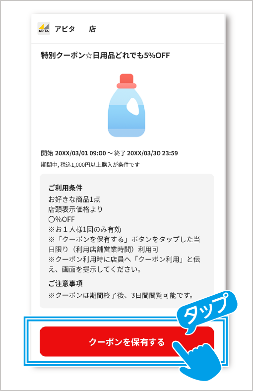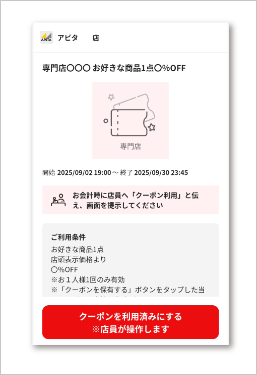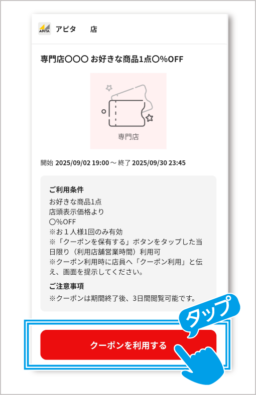 - ・クーポンは3時間保有することが可能です。利用されなかったクーポンは保有がキャンセルされます。