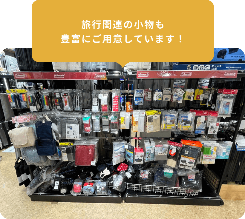 様々なキャリーケースと共に旅行に必要な小物も“実物を見て”選ぶことができます!
